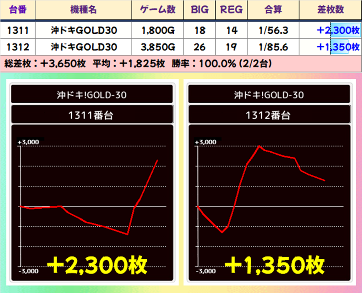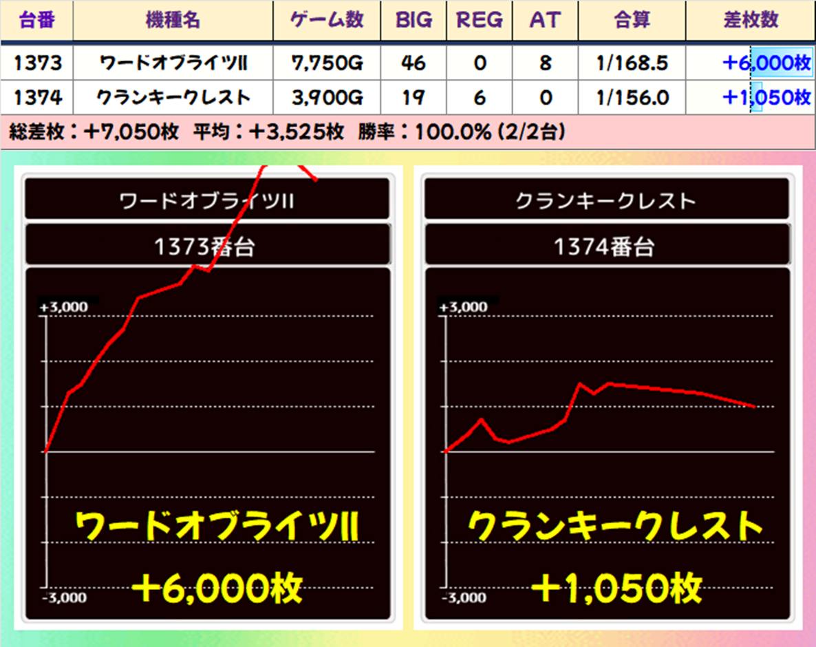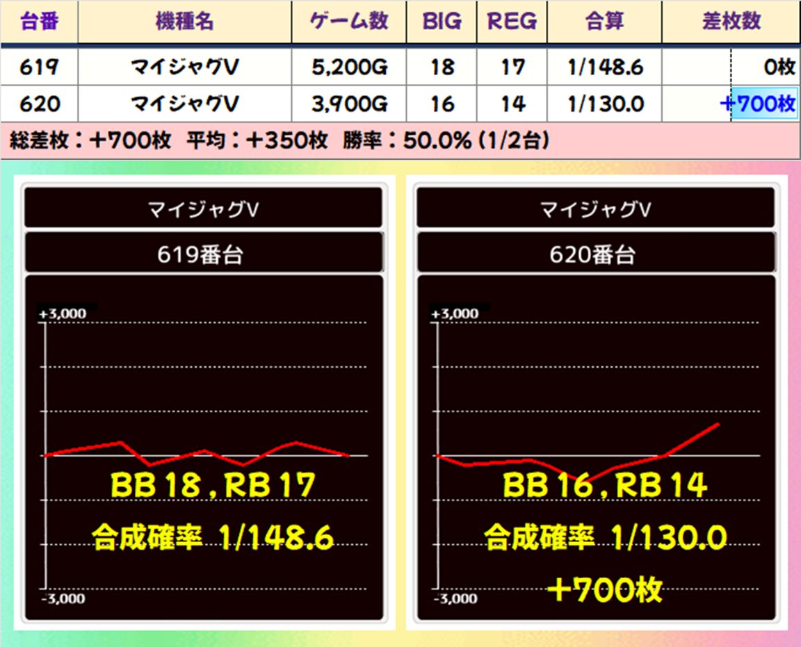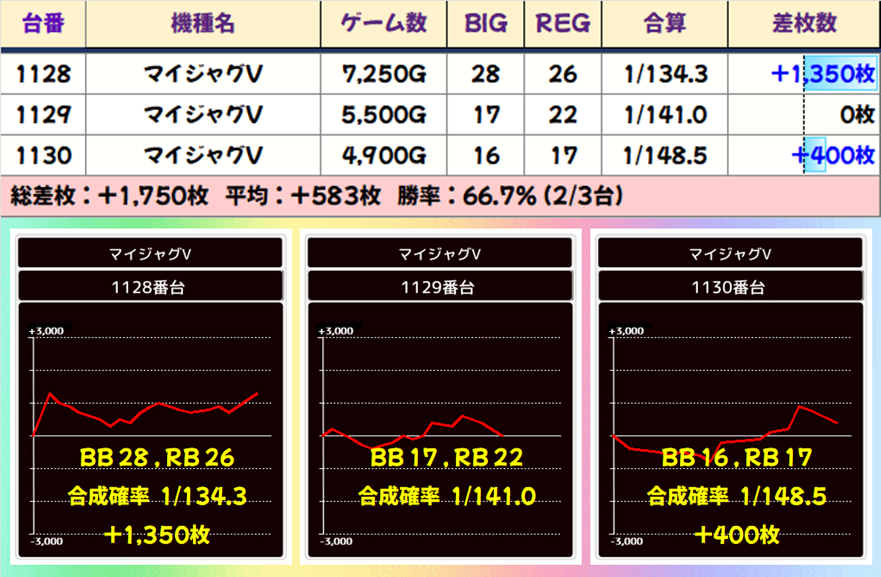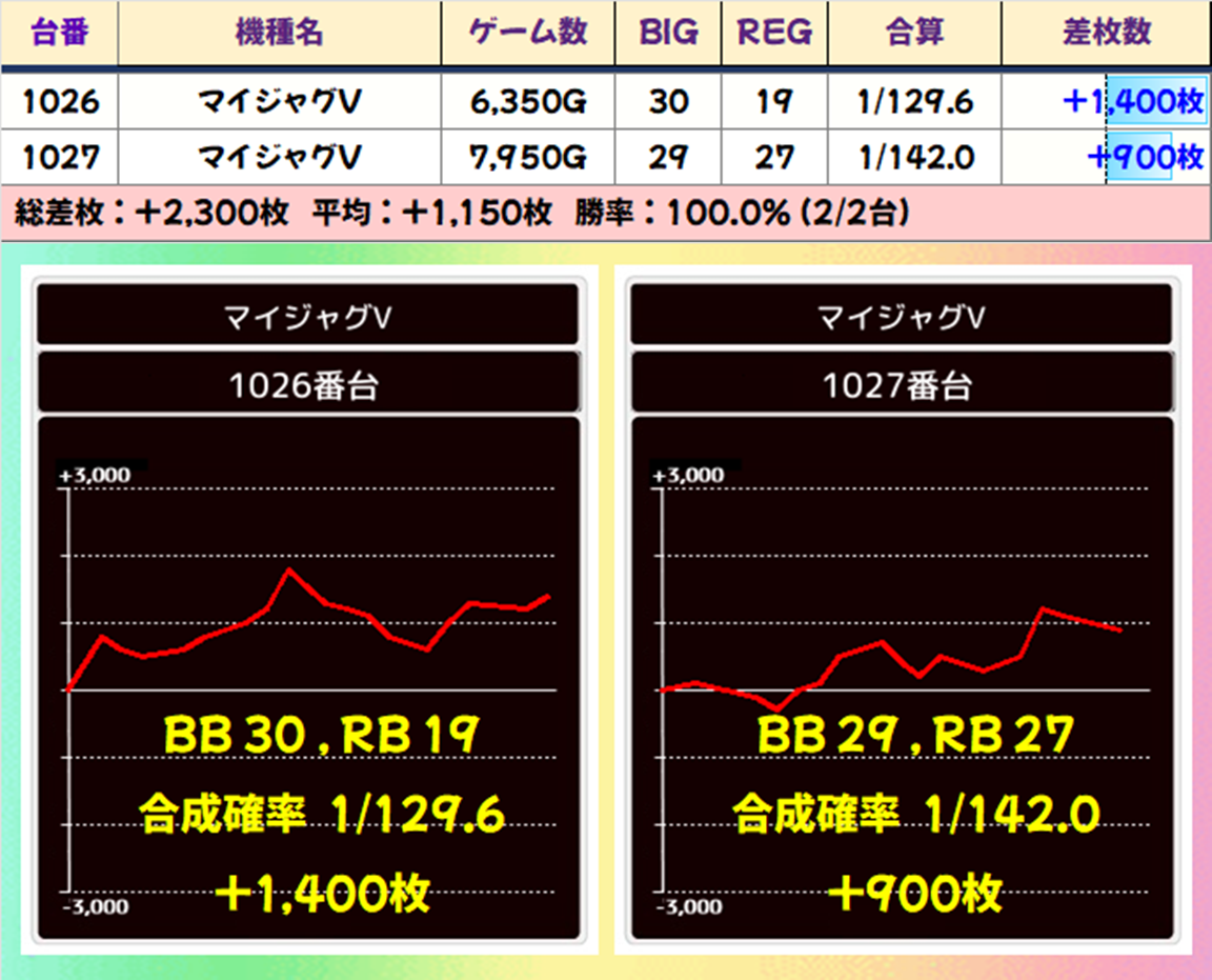結果は平均差枚+400枚で3台中2台がプラス差枚。打ち込みが伸びていればもっと盛り上がっていたでしょうね。