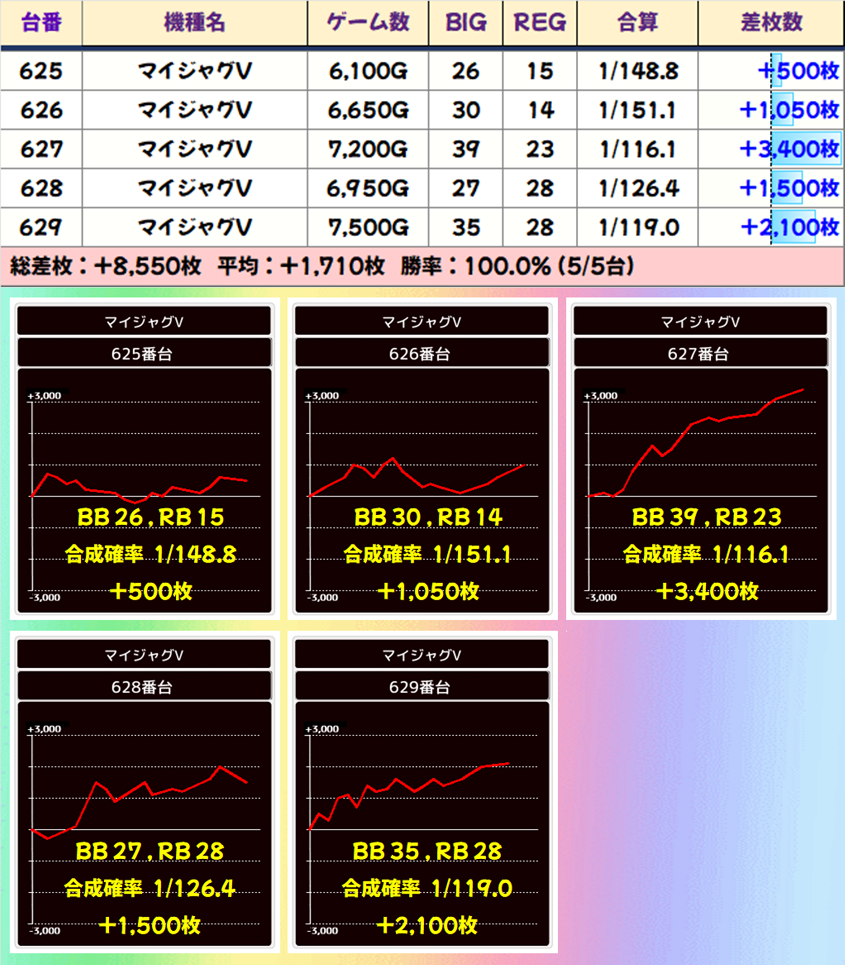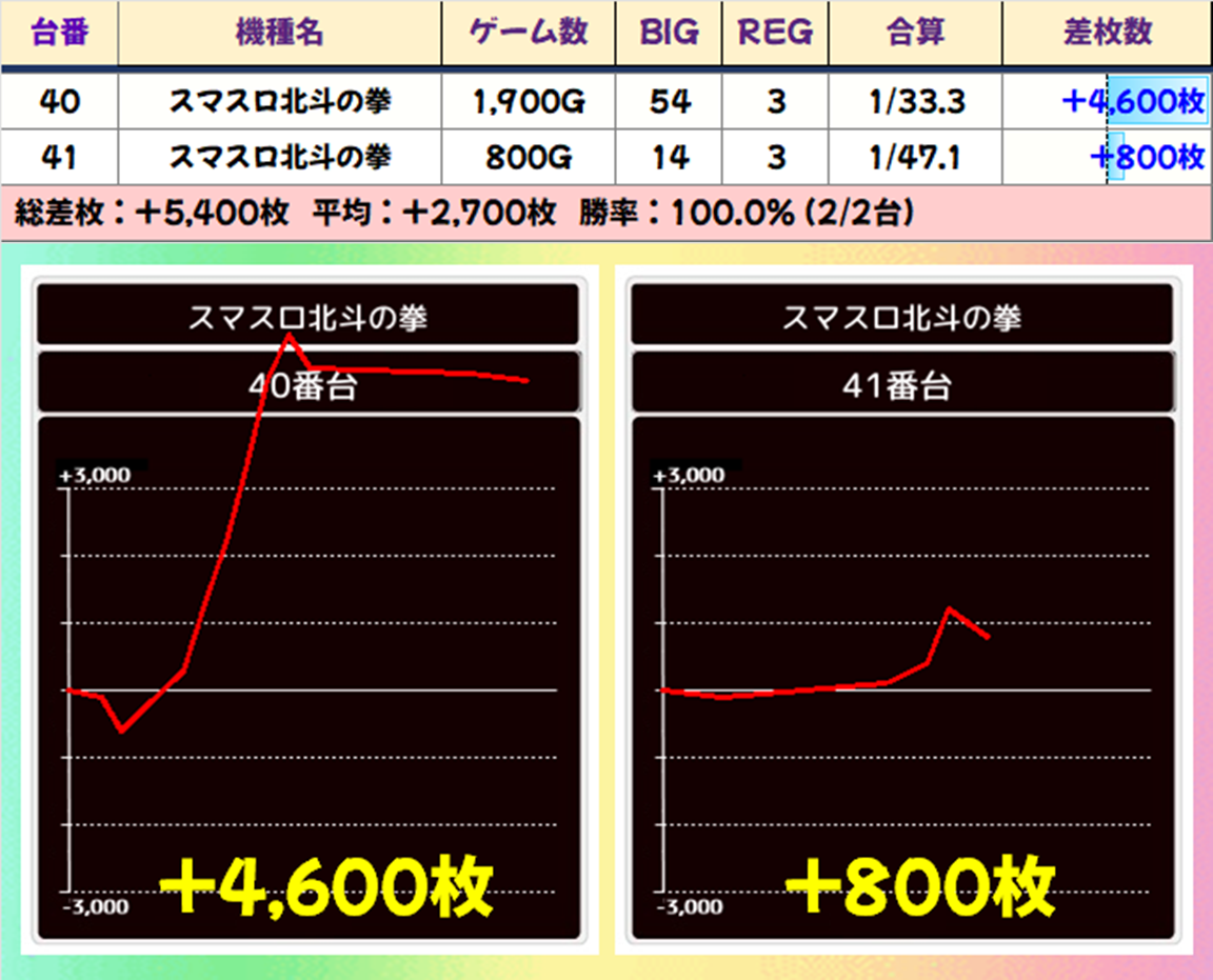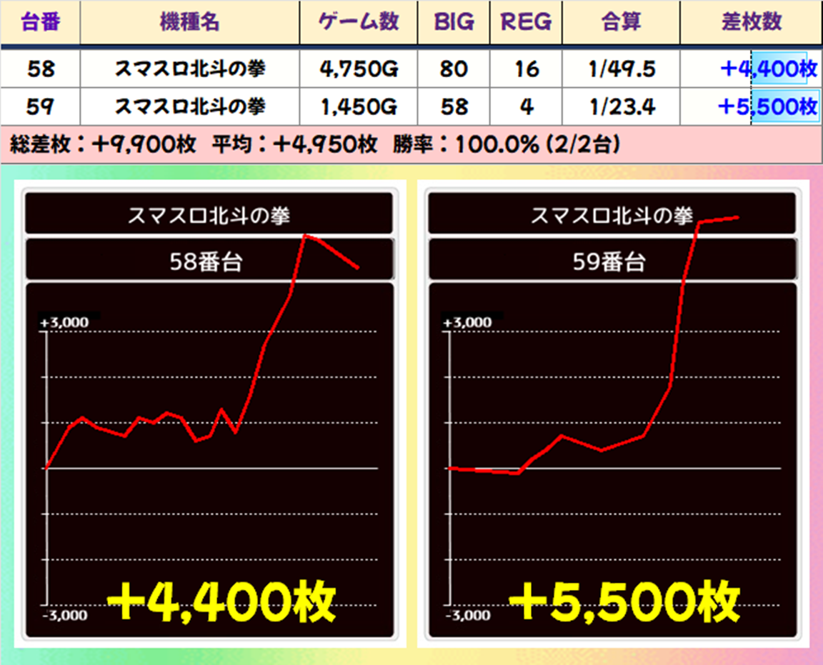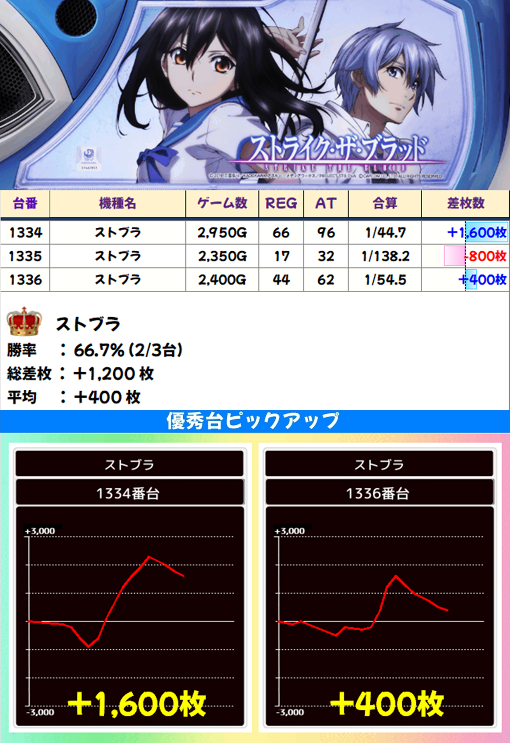 結果は平均差枚+400枚で3台中2台がプラス差枚。打ち込みが伸びていればもっと盛り上がっていたでしょうね。