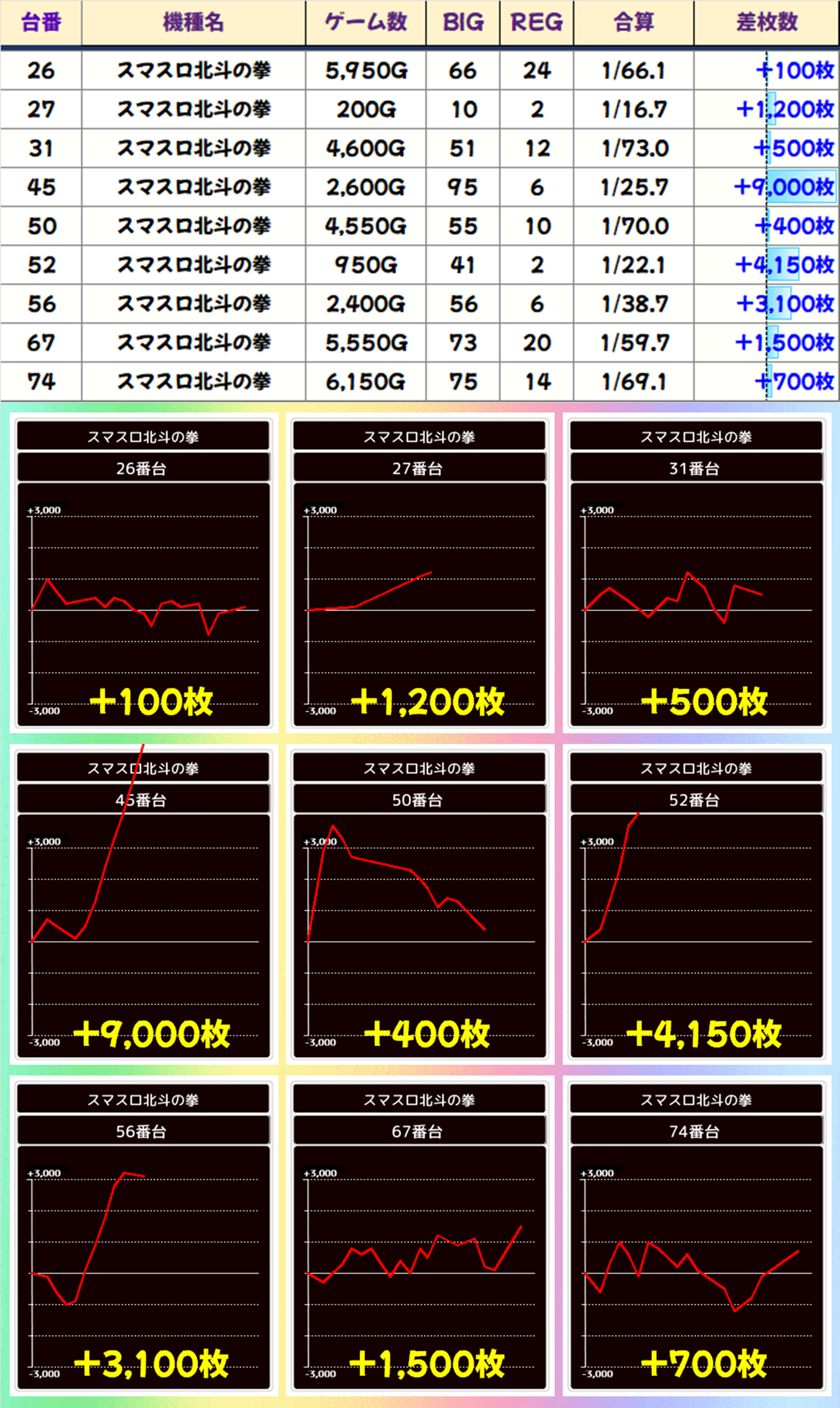 その他の山佐系の機種にもしっかりお宝台が! 「キン肉マン」から+8,950枚、「キングパルサー」から+4,150枚と大量出玉獲得台が出現しましたが、8のつく日にしては優秀台が少なすぎ? 結果は時の運なので仕方ありませんが、残念ながら不発に終わってしまったお宝台が複数あったと思われます。