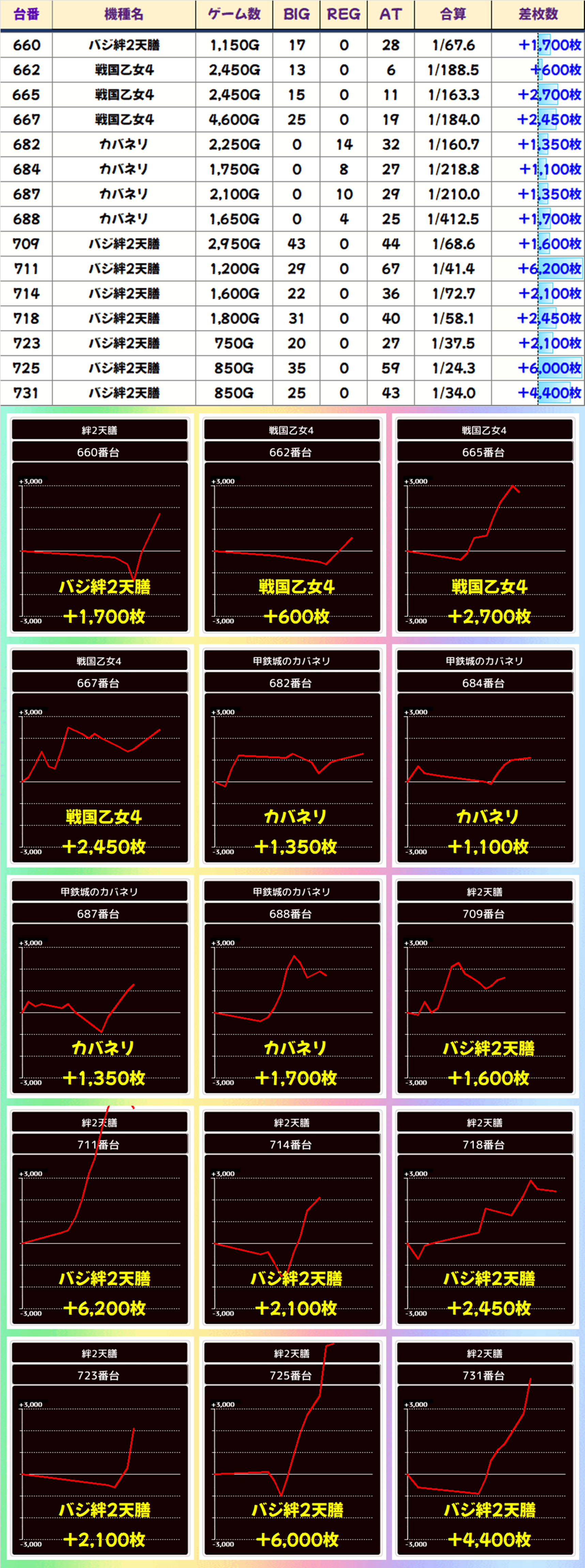 毎日カブくぜ機種の「バジ絆2天膳」「戦国乙女4」「カバネリ」の3機種は単品仕掛け。「バジ絆2天膳」から+6,200枚、+6,000枚、+4,400枚と爆発台が複数出現しました。