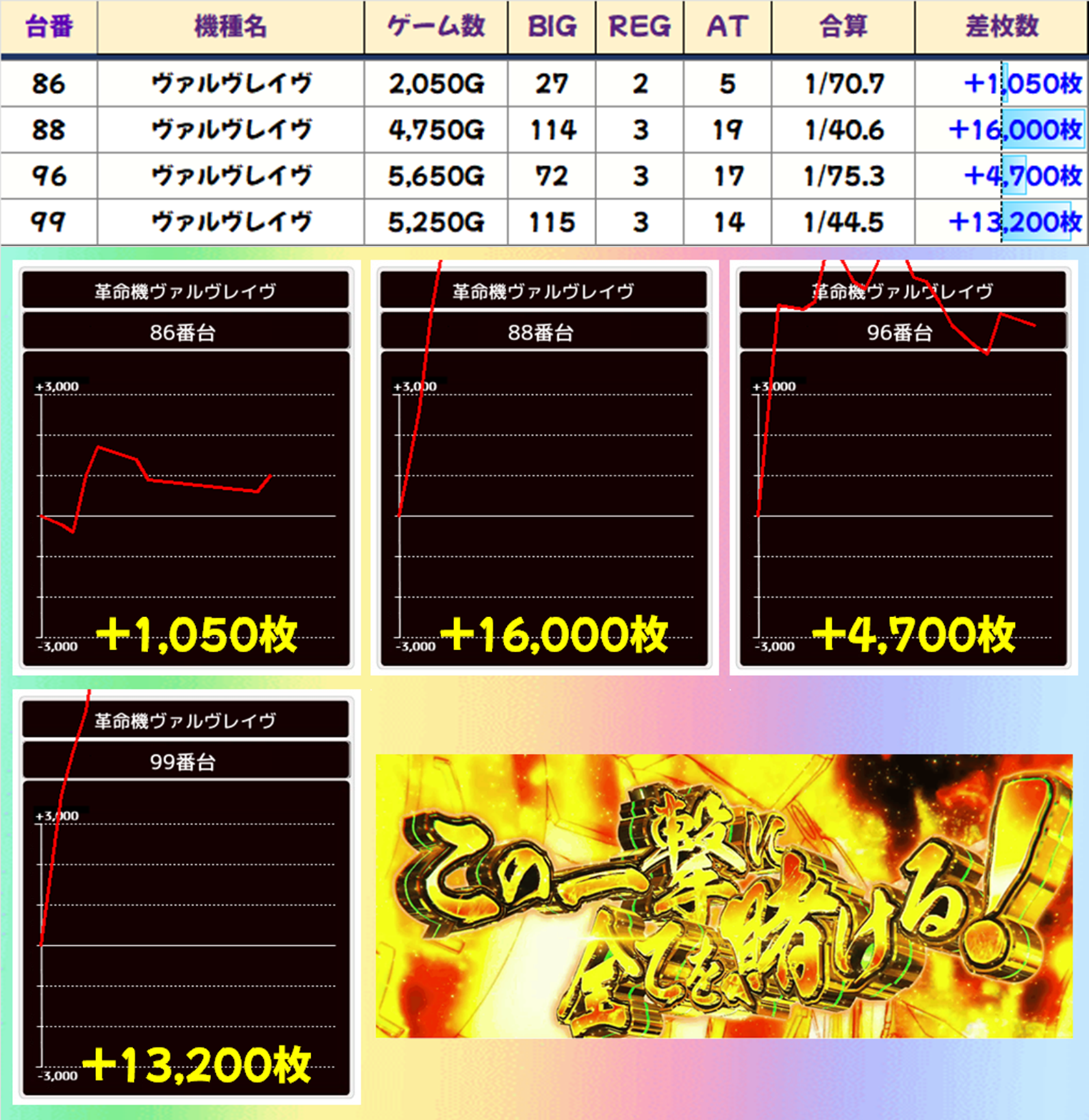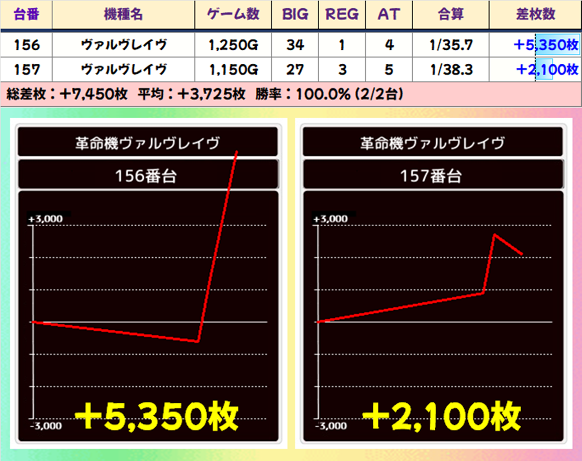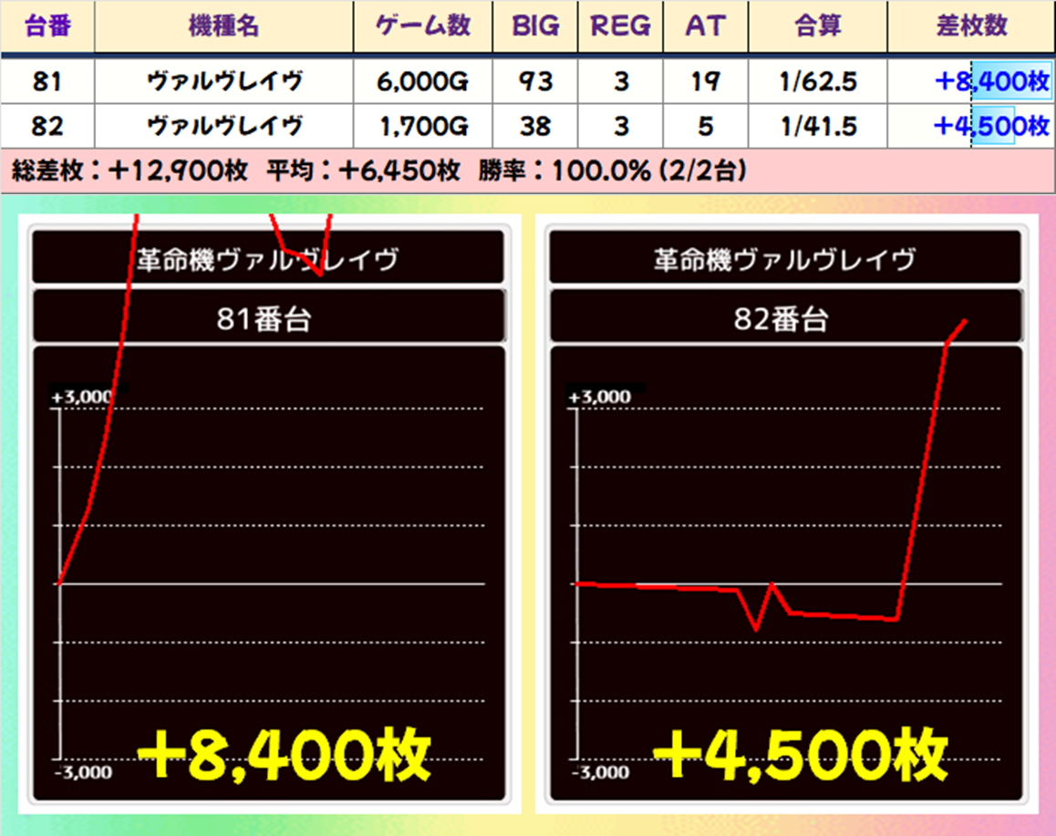毎日オススメ機種の「ヴァルヴレイヴ」には2台並びが2か所。2か所の2台並びの結果は平均差枚+6,450枚、+3,725枚で全台プラス差枚。+8,400枚、+5,350枚、+4,500枚と3台が大量出玉を獲得して勝利を収めました。