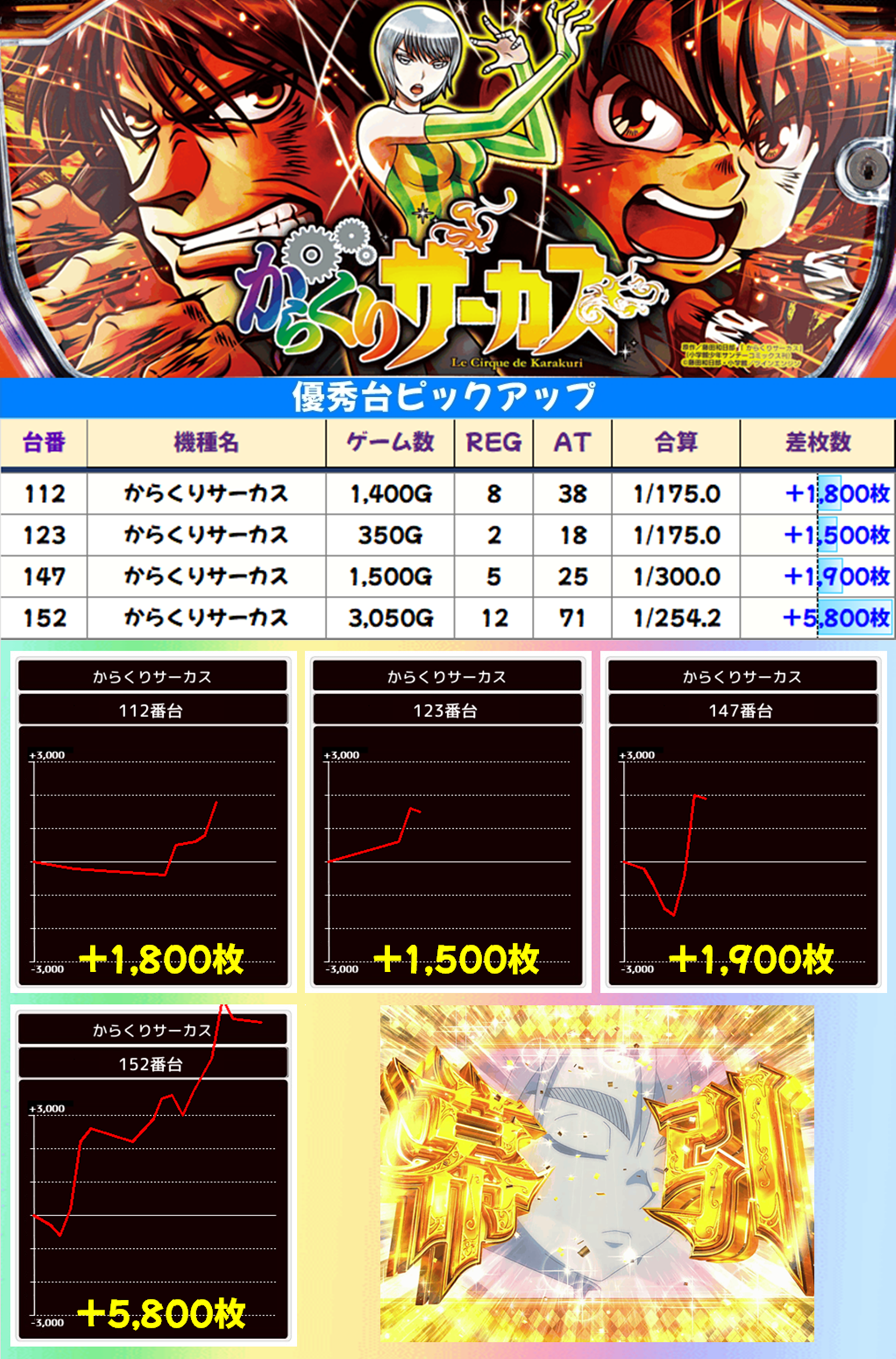 「からくりサーカス」は単品仕掛け。+5,800枚を筆頭に4台が1,500枚以上の出玉を獲得!