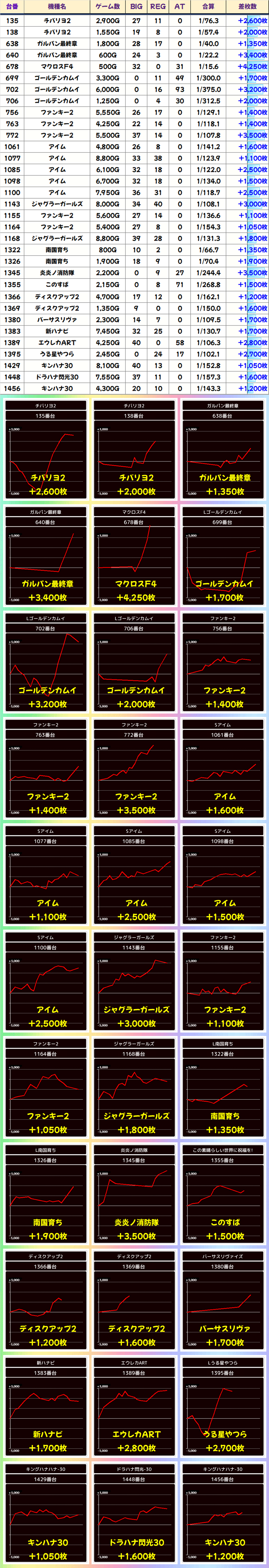 単品からは万枚オーバーが2台! 88番台の+16,000枚、99番台の+13,200枚が本日の差枚数ランキングの1位と2位に! 本日は並びも単品も高品質なお宝台が結果を残しました!