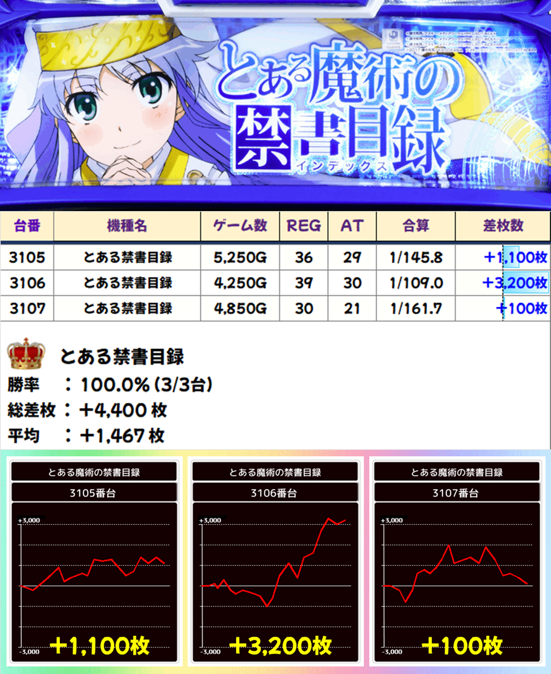 3台設置の「とある禁書目録」が全台系濃厚。結果は平均差枚+1,467枚で3台がプラス差枚。中盤から出玉を積み重ねた3106番台が3,000枚以上の出玉を獲得しました。