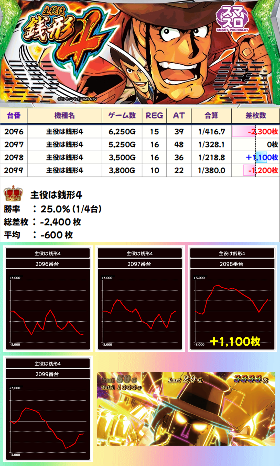 4台設置の「主役は銭形4」も全台系濃厚。2098番台が1,000枚以上の出玉を獲得しましたが、全体的には「グランベルム」と同じく不発で終わってしまいました。