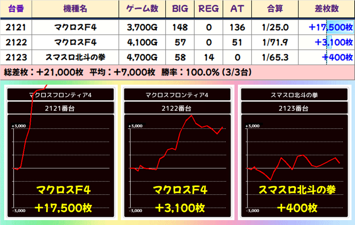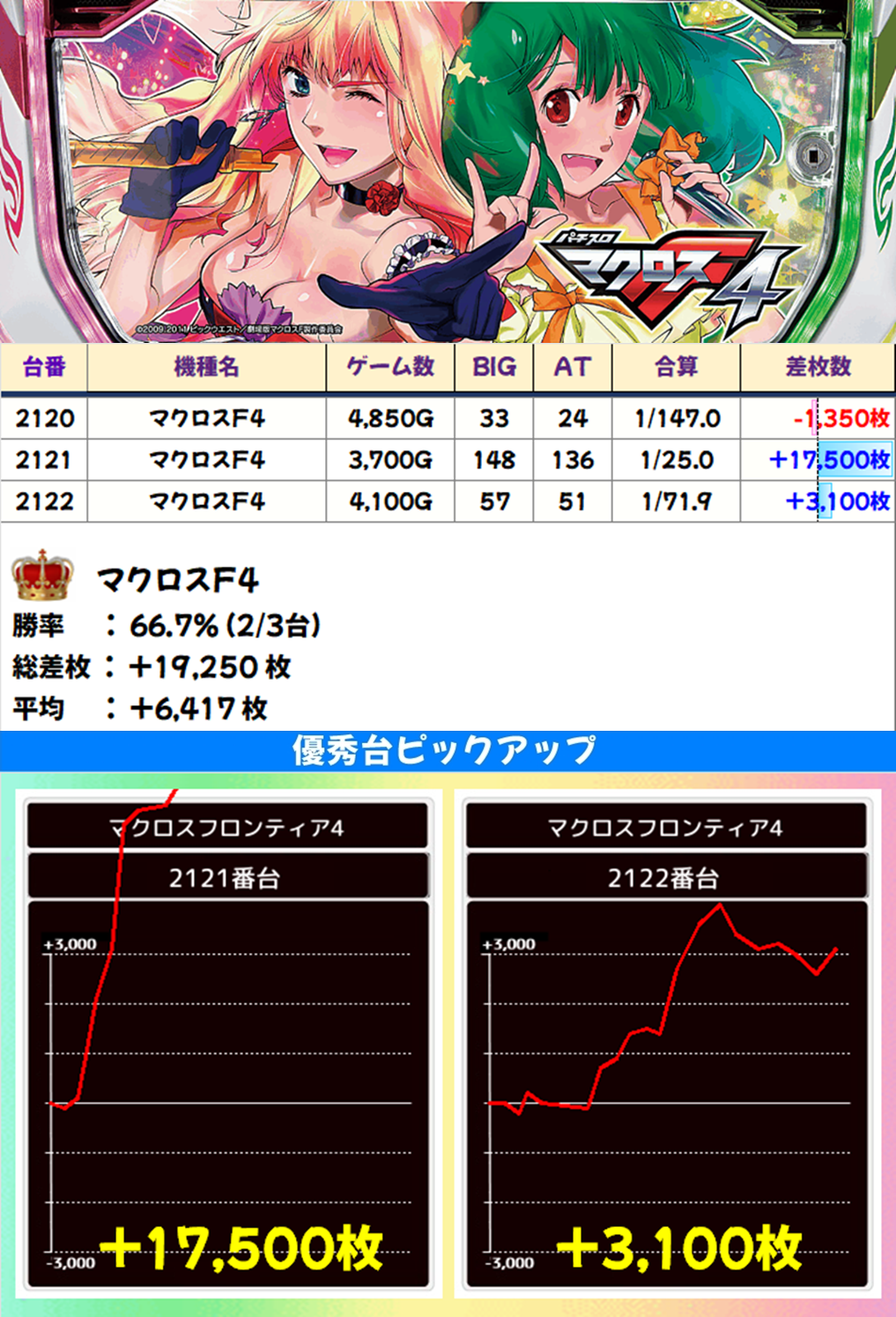 3台設置の「マクロスF4」が1/2系濃厚。結果は総差枚+19,250枚、平均差枚+6,417枚で3台中2台がプラス差枚。2121番台がコンプリートに迫る17,500枚オーバーの出玉を獲得!