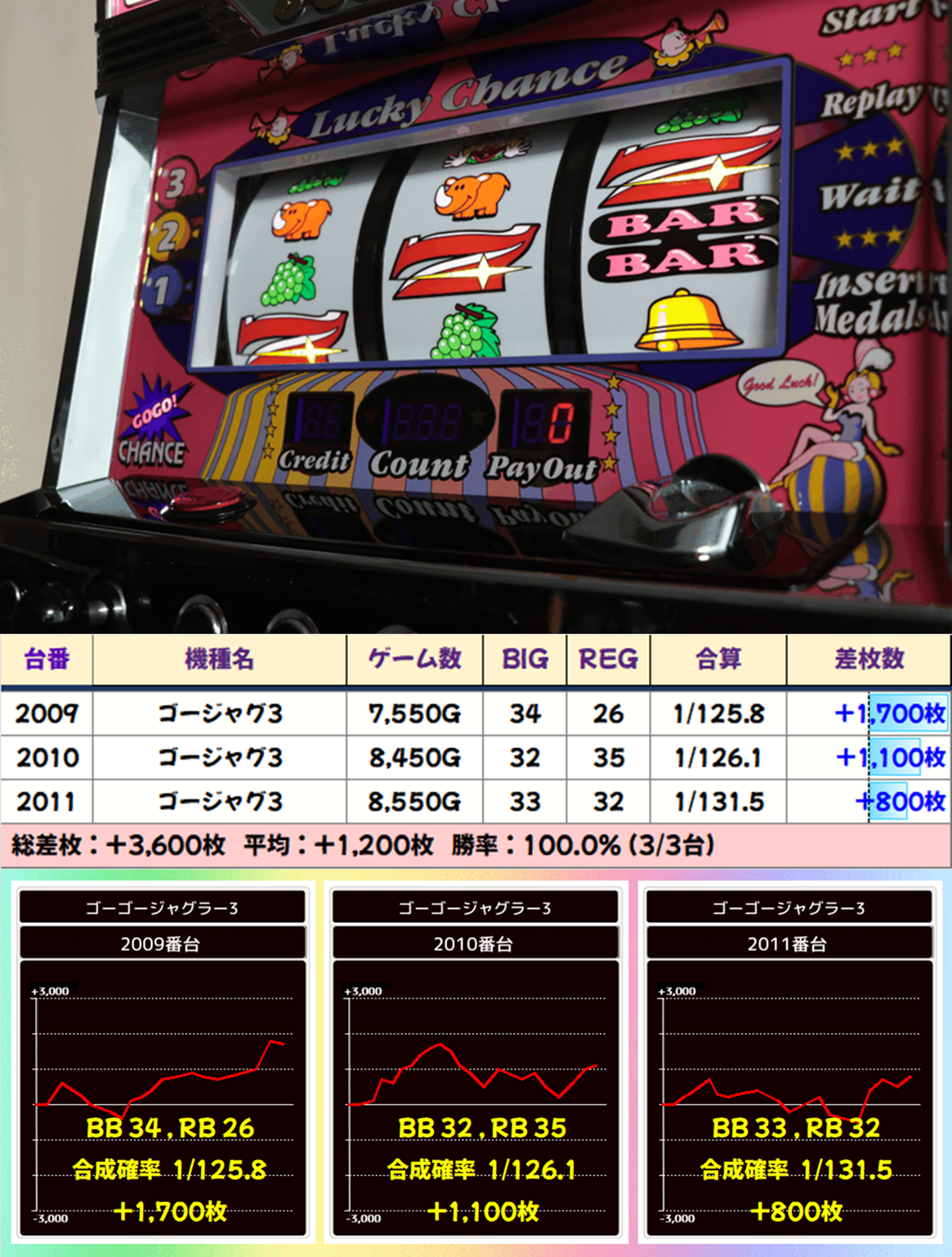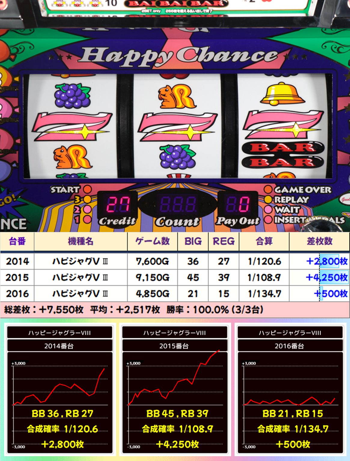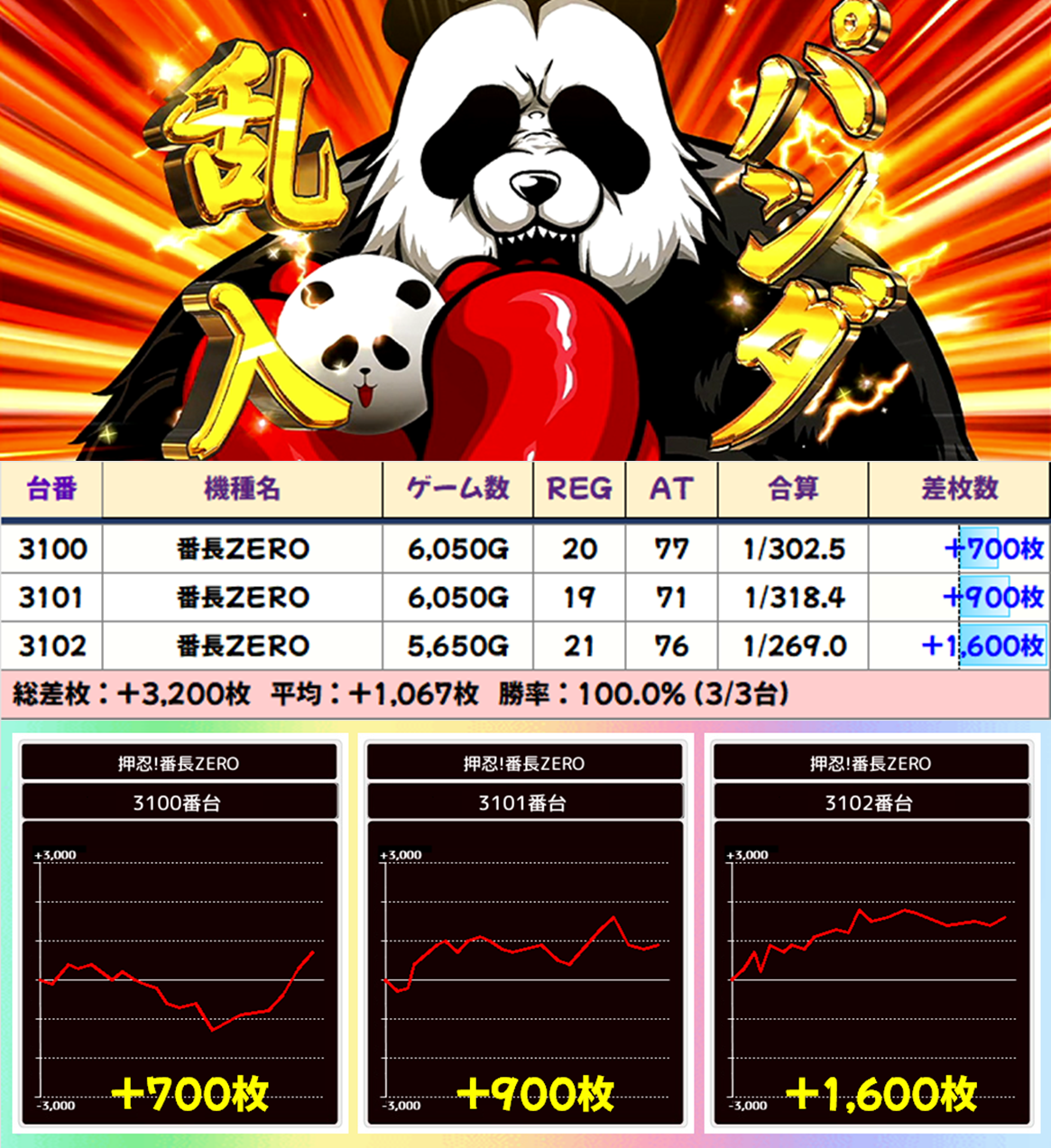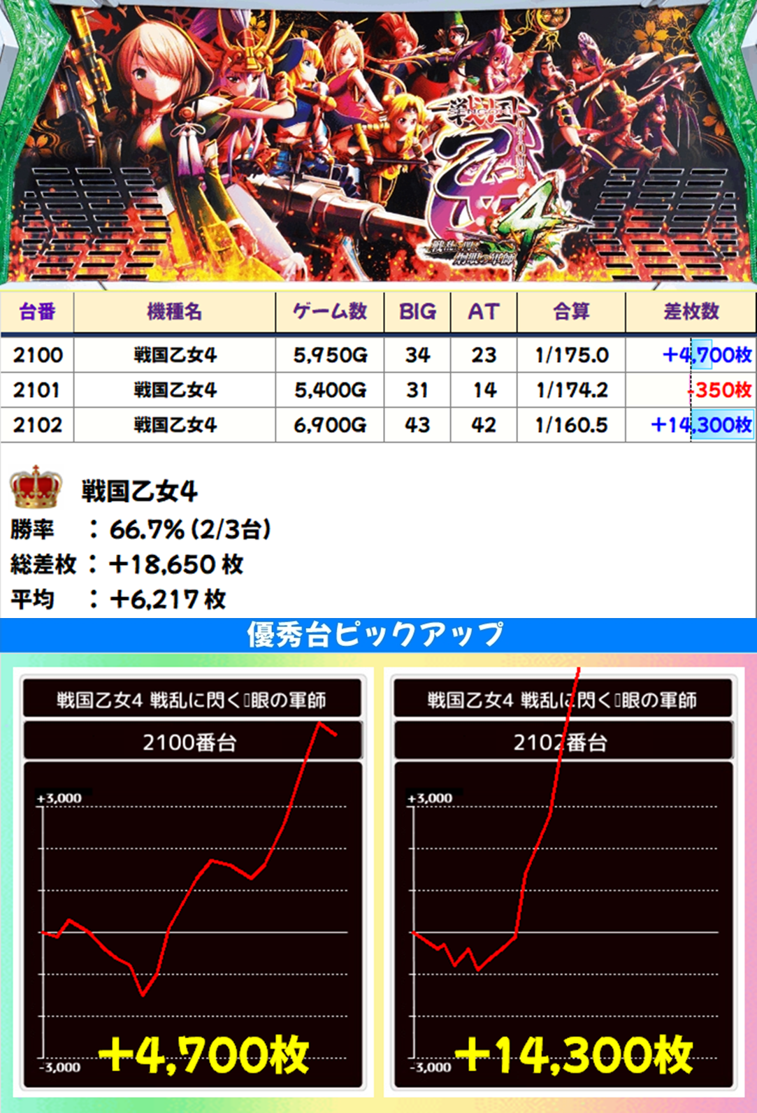 3台設置の「戦国乙女4」も1/2系濃厚。結果は総差枚+18,650枚、平均差枚+6,217枚で3台中2台がプラス差枚。+14,300枚、+4,700枚とプラスの2台はともに大量出玉を獲得しました。
