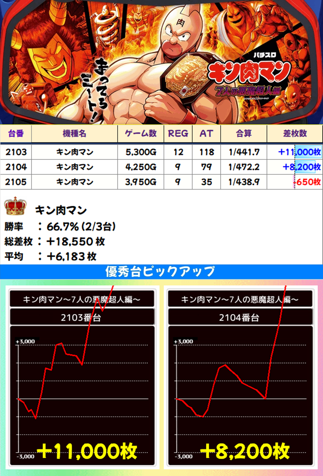 3台設置の「キン肉マン」も半分以上がお宝台。結果は総差枚+18,550枚、平均差枚+6,183枚で3台中2台がプラス差枚。プラスの2台はともに8,000枚オーバーの出玉を炸裂させました!