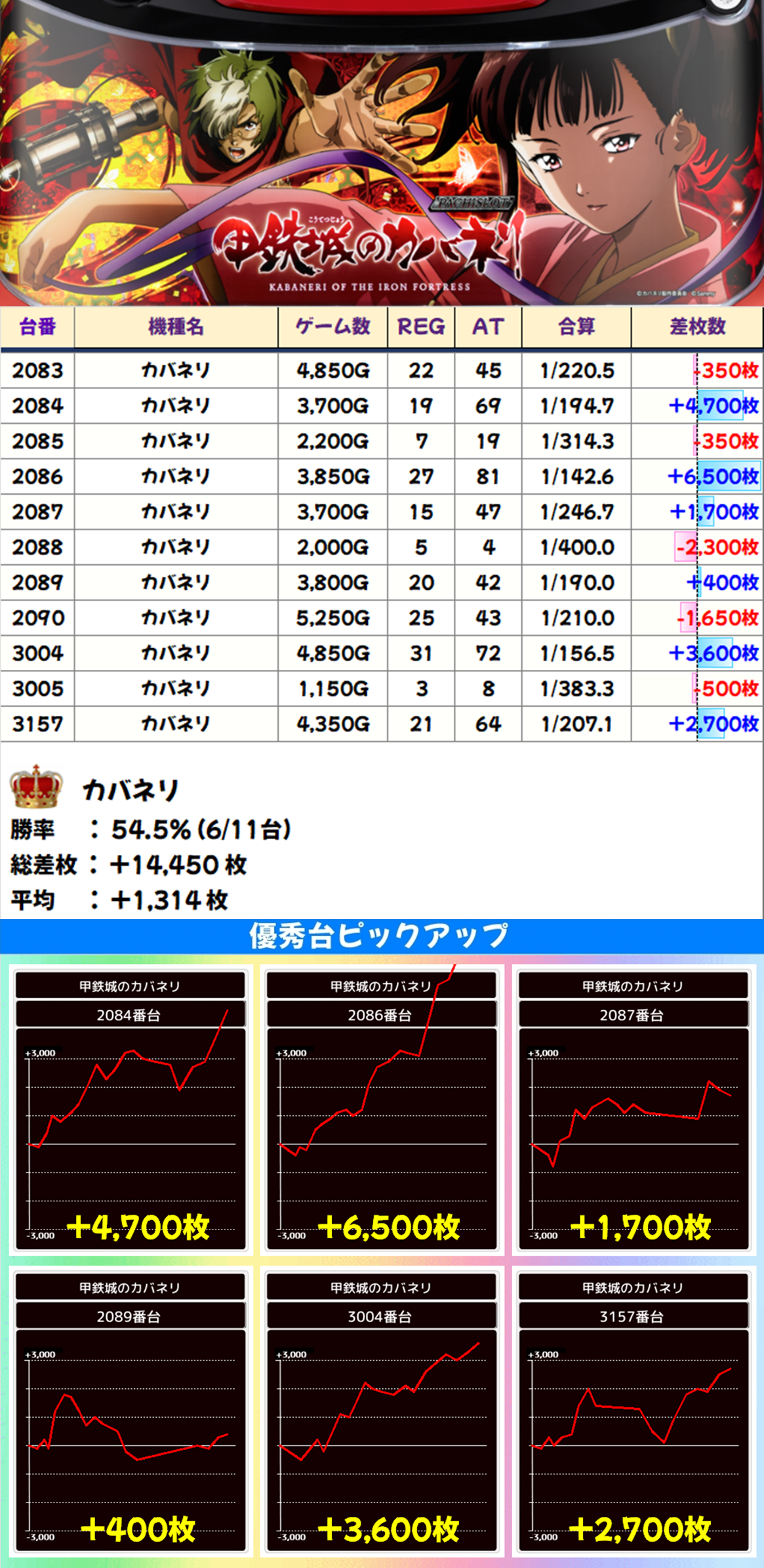 11台設置の「カバネリ」も1/2系濃厚。結果は平均差枚+1,314枚で6台がプラス差枚。+6,500枚を筆頭に5台が1,500枚以上の出玉を獲得しました。
