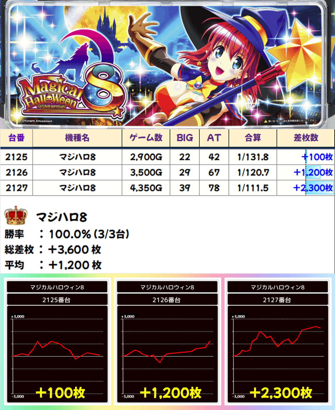 3台設置の「マジハロ8」も1/2系濃厚。結果は平均差枚+1,200枚で全台プラス差枚。2125番台が不発気味だっただけで、もしかしたら全台お宝台だったのかもしれませんね。