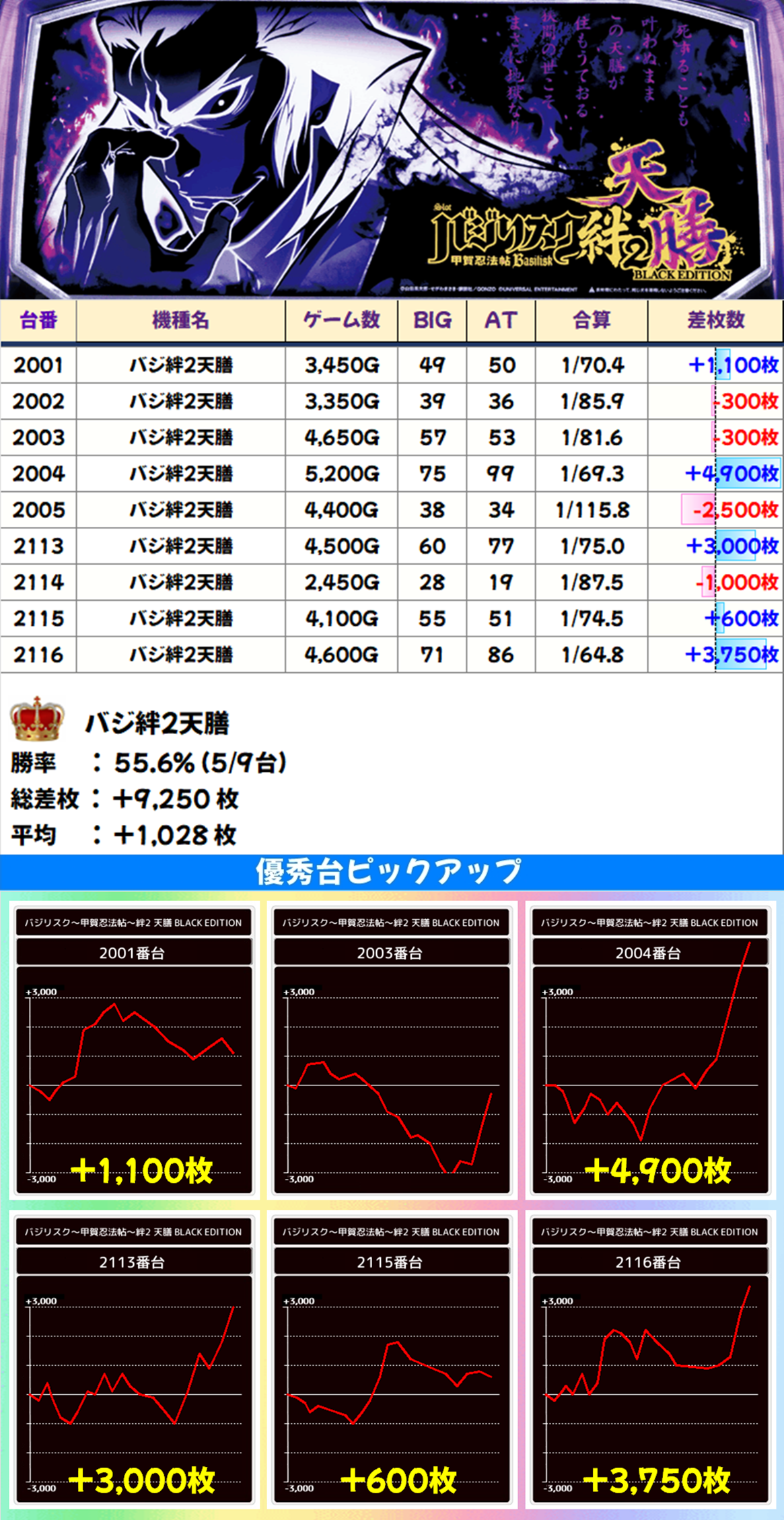 「バジ絆2天膳」も1/2系濃厚。お宝台間違いなしの3台が3,000枚以上の出玉を獲得して大勝利!