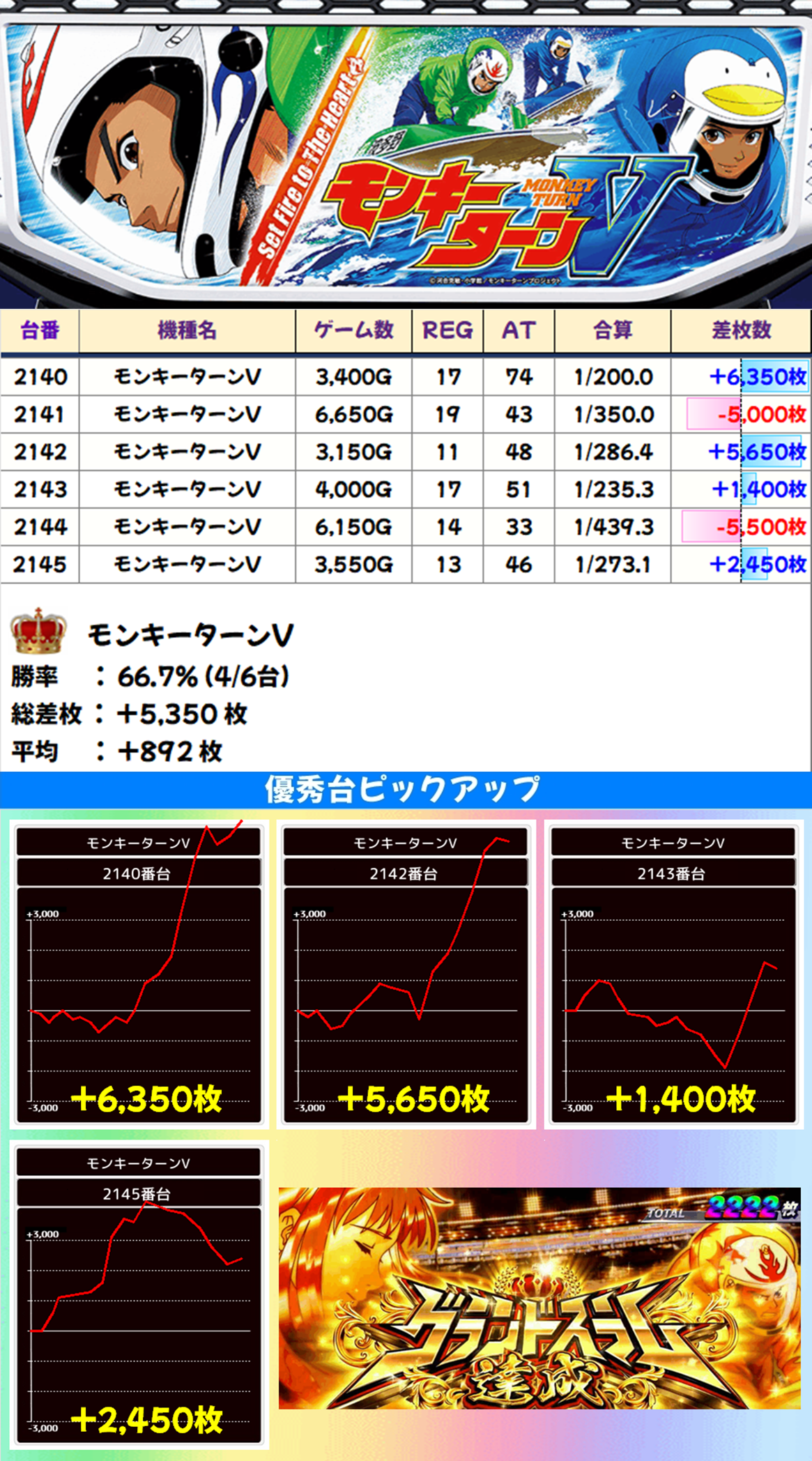 6台設置の「モンキーターンV」も1/2系濃厚。結果は平均差枚+892枚で4台がプラス差枚。プラスの台は結果が出ている、マイナスの台もしっかり打ち込まれている。全台系だった可能性も?