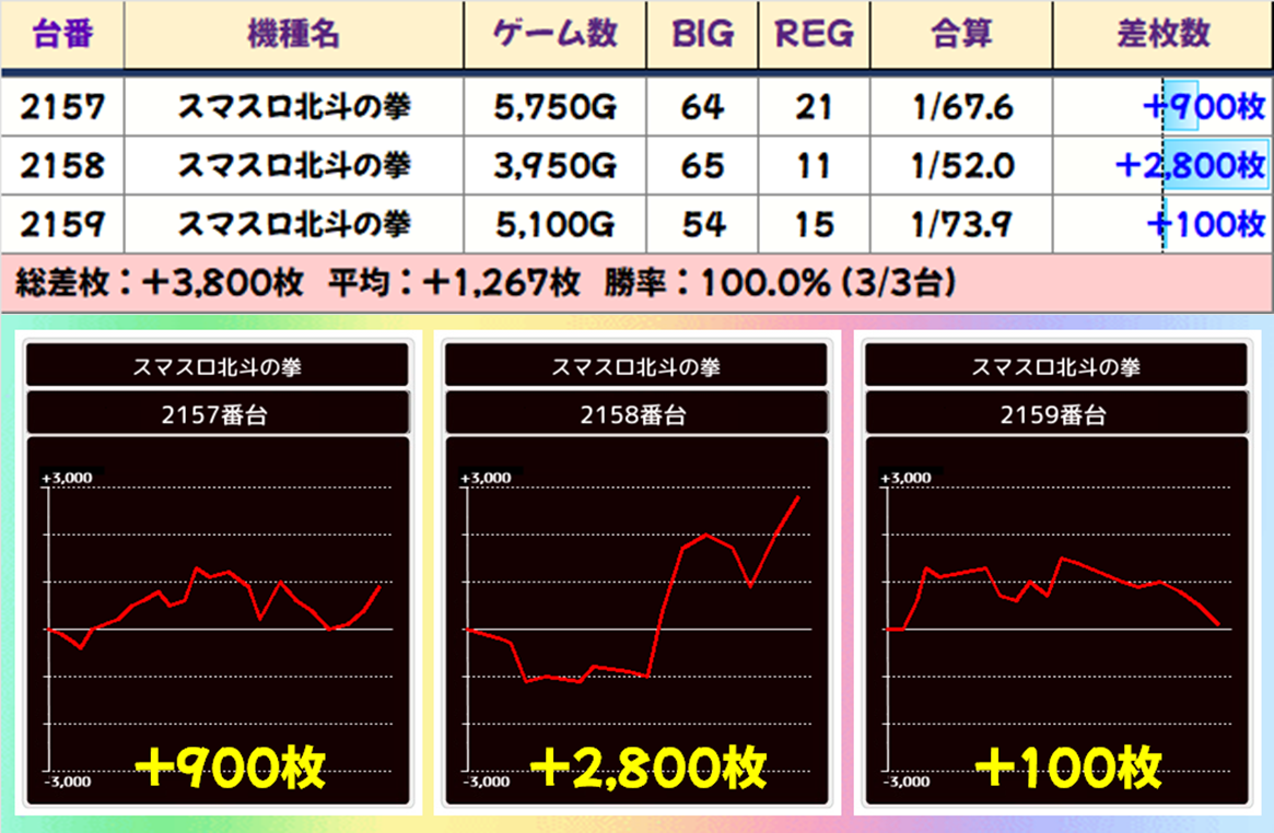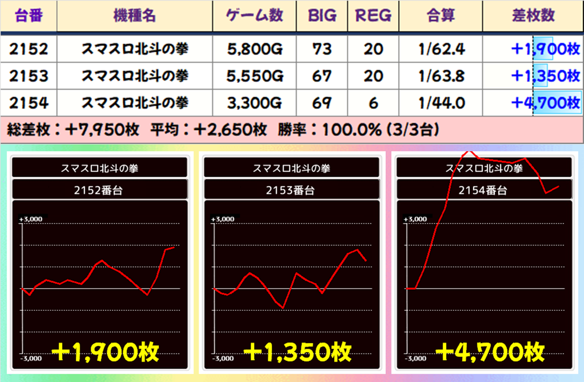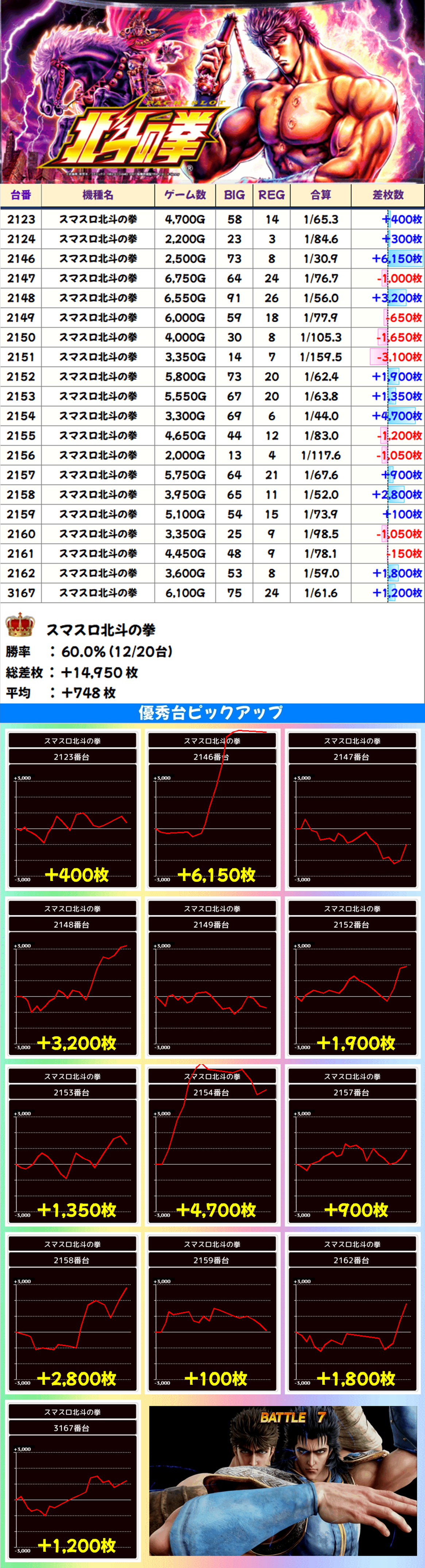 20台設置の「スマスロ北斗の拳」も半分以上がお宝台の高配分。12台がプラス差枚で+6,150枚を筆頭に8台が差枚数+1,000枚以上の結果に!