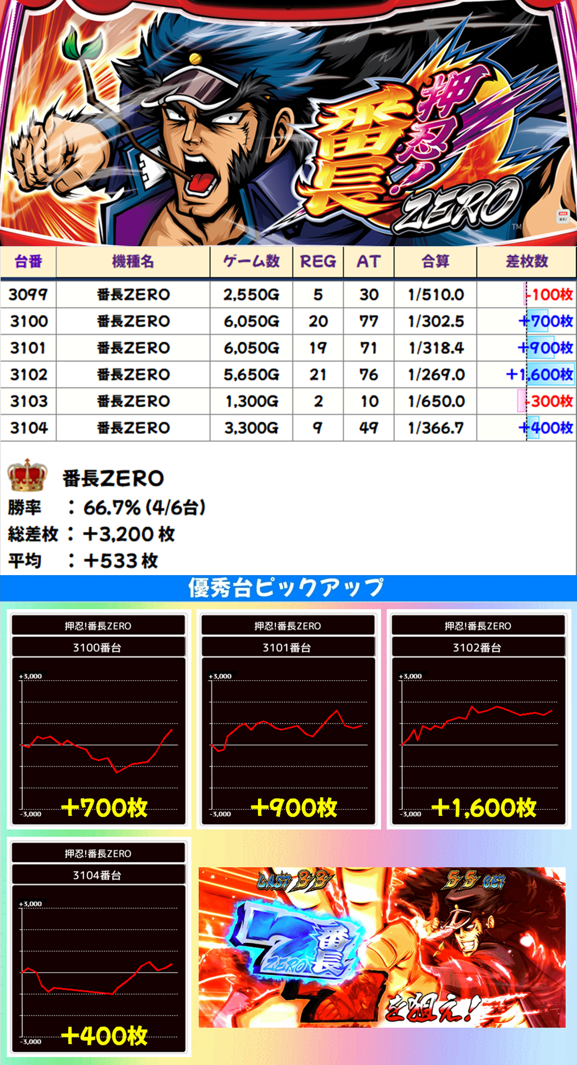 6台設置の「番長ZERO」も1/2系濃厚。初当りの回数でわかる通り、3台並びの仕掛けも複合していました。