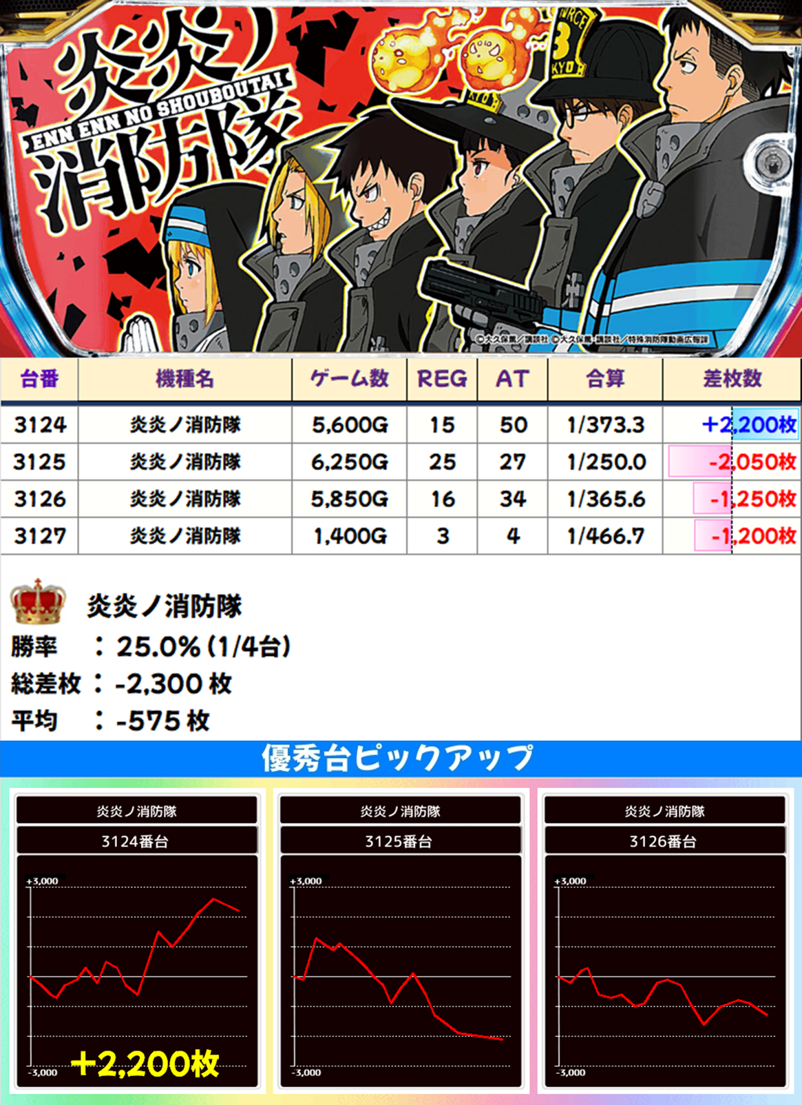 4台設置の「炎炎ノ消防隊」も1/2系濃厚。3124番台は結果がついてきましたが、不発に終わってしまったお宝台が複数あったみたいですね。