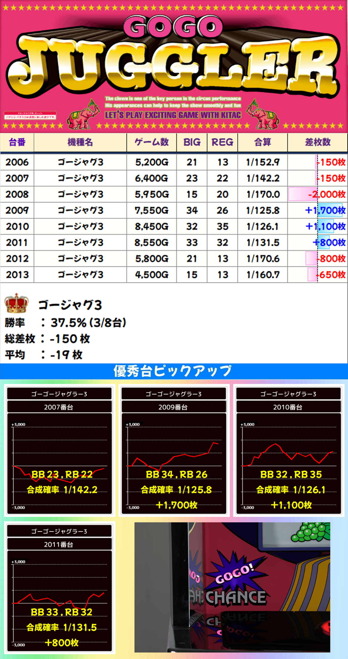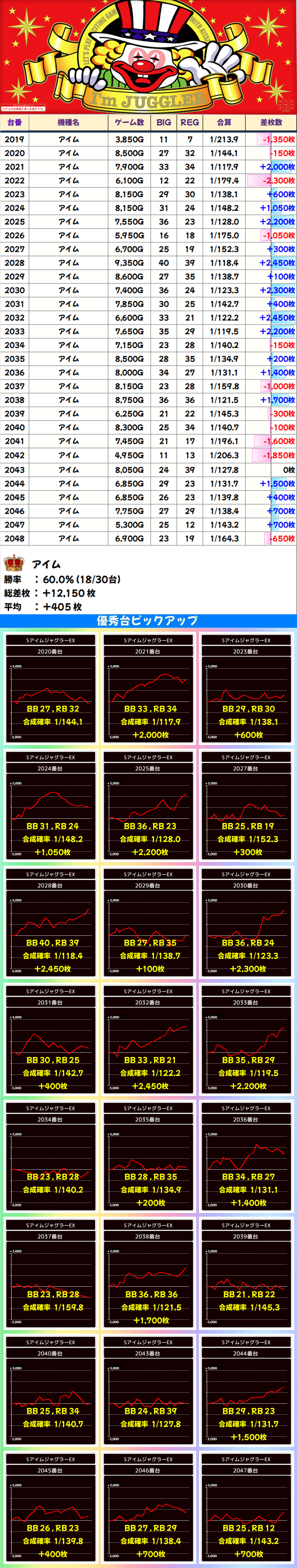 ジャグラーシリーズも抜かりナシ! 「アイム」「ハピジャグV」「ゴージャグ3」の3機種が1/2系濃厚! 3台以上並びの仕掛けも多数複合していました。