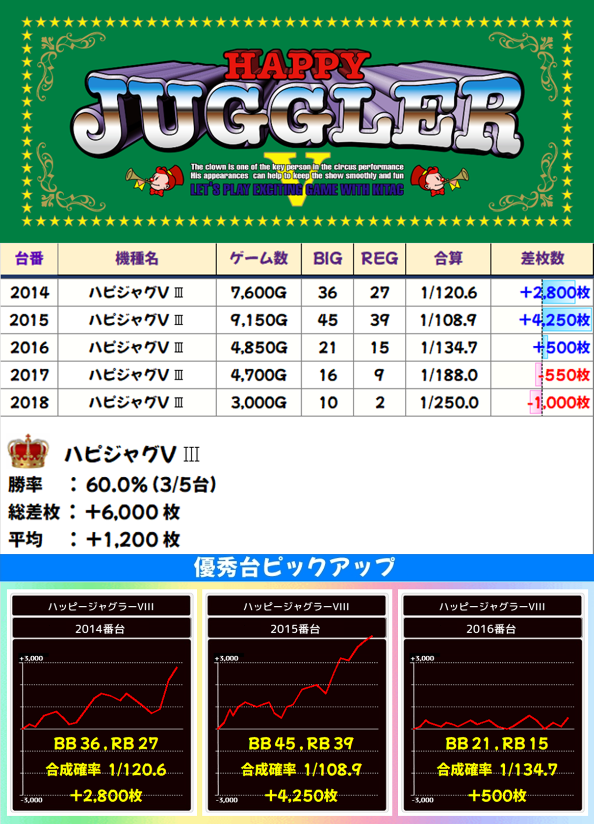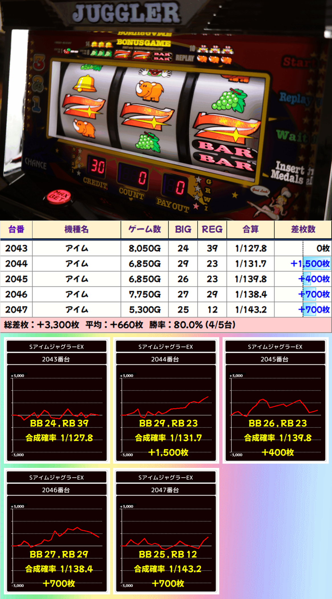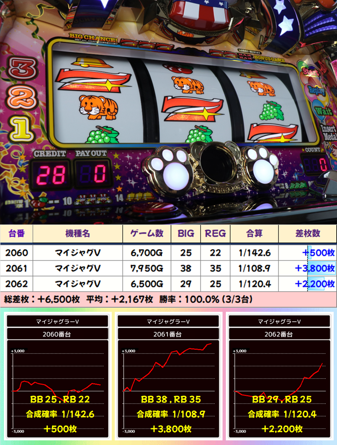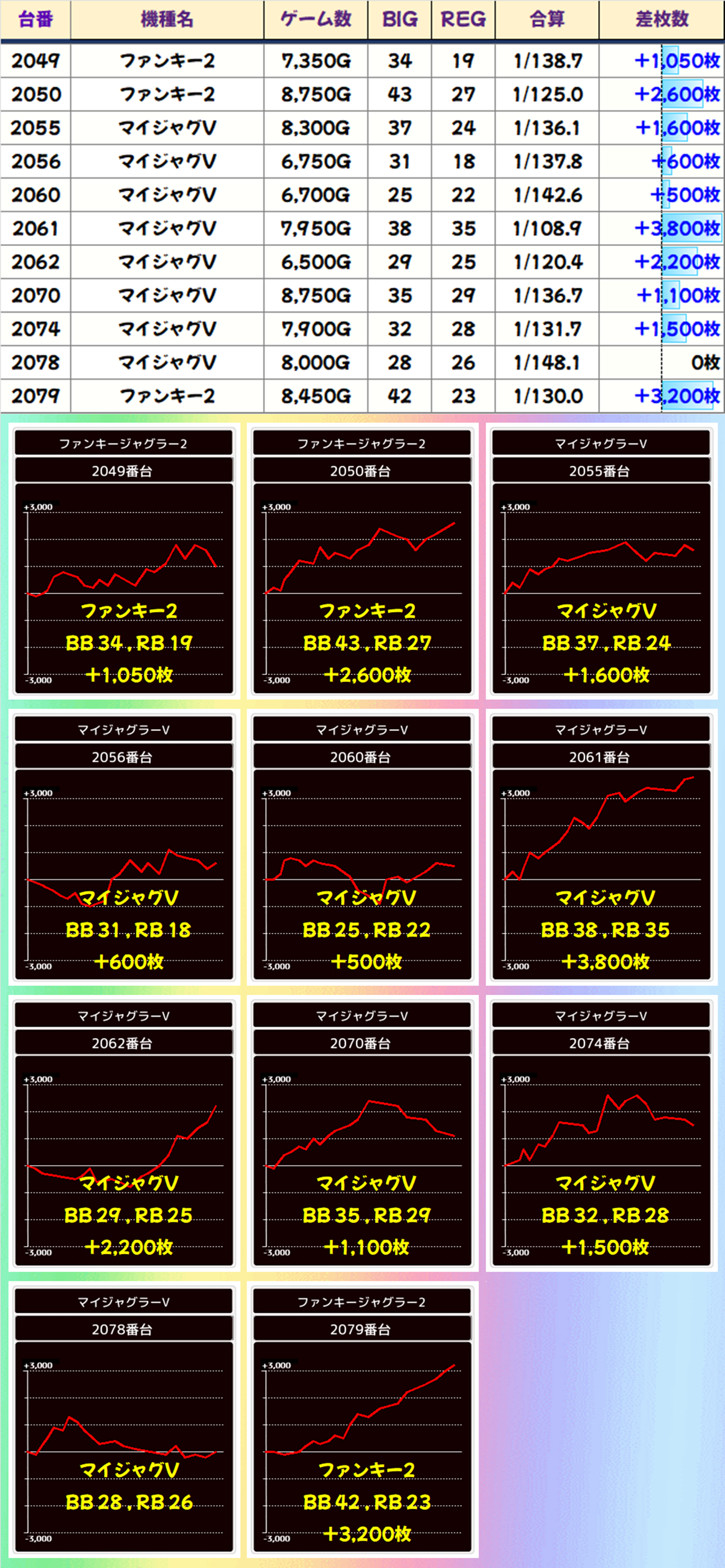 「マイジャグV」と「ファンキー2」も高配分だったのでジャグラーシリーズはお宝台だらけ! ジャグラーシリーズ全体の結果は総差枚+21,800枚、平均差枚+283枚で38台がプラス差枚となりました。