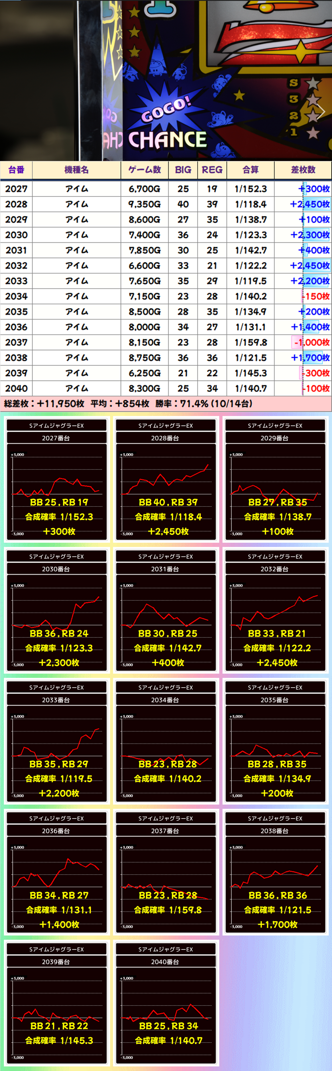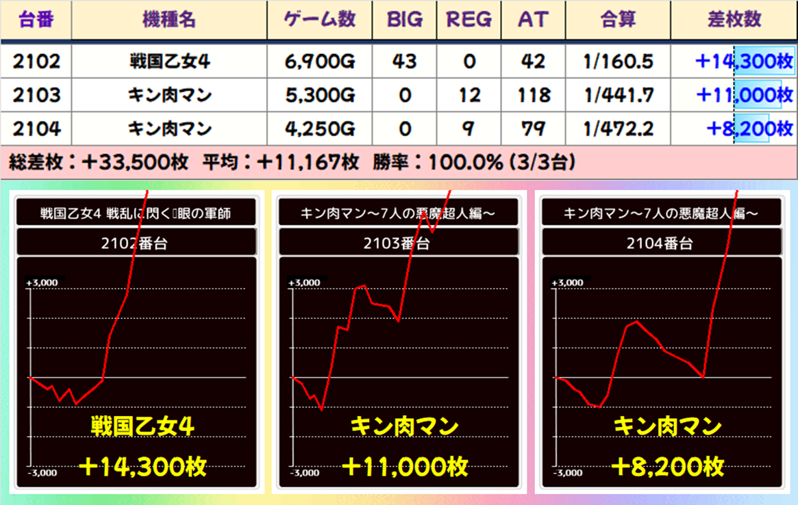 ド派手な塊も複数出現! 「戦国乙女4」+「キン肉マン」の3台並びはそこだけで総差枚+33,500枚! +14,300枚、+11,000枚、+8,200枚と3台とも大爆発! 「アイム」からは14台並びも出現しました。
