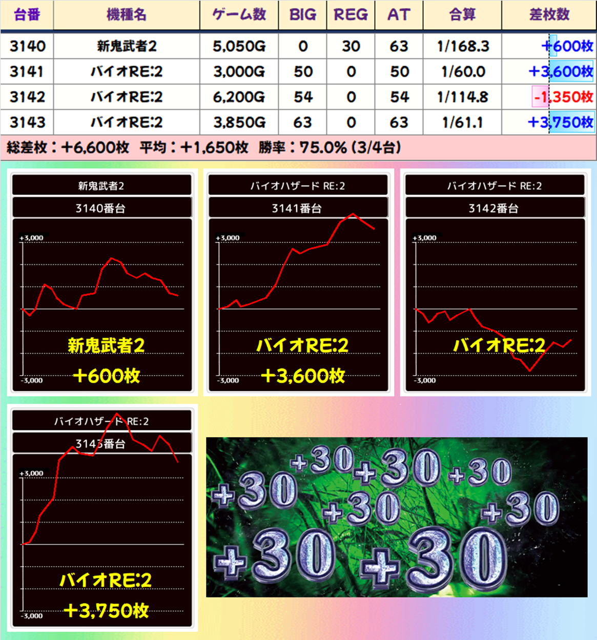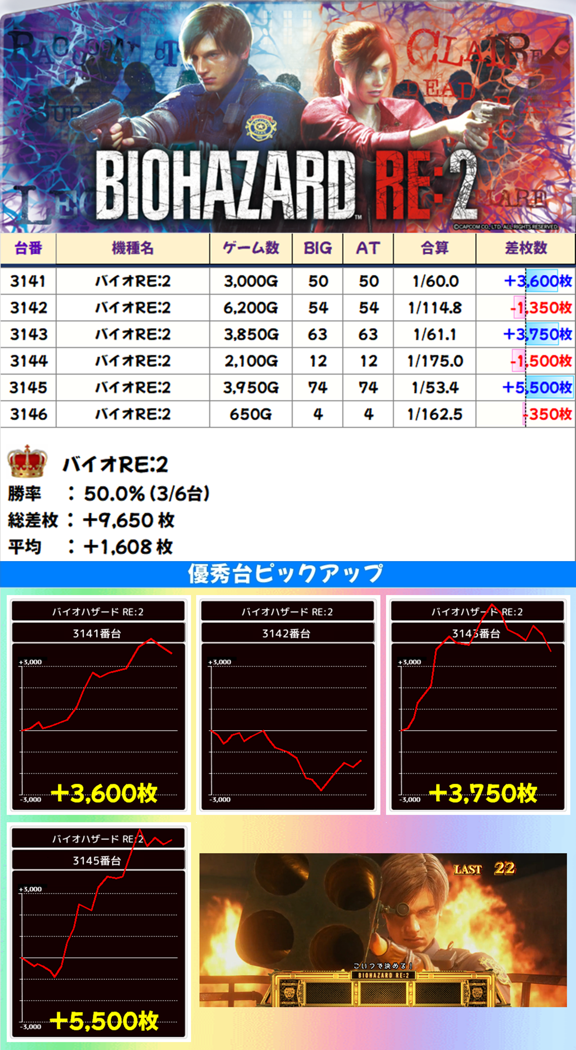 6台設置の「バイオRE:2」も1/2系濃厚。結果は平均差枚+1,608枚で6台中3台がプラス差枚。+5,500枚、+3,750枚、+3,600枚とお宝台濃厚の3台がまとまった出玉を獲得!