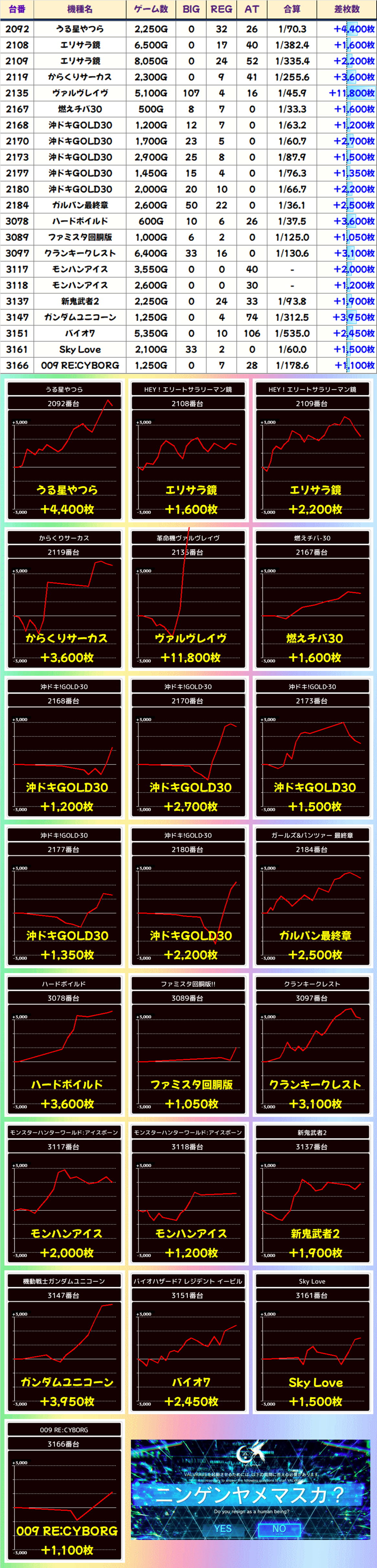 全台系濃厚機種は不発気味の結果でしたが、1/2系濃厚機種は大爆発! 大量出玉獲得台が続出しました!