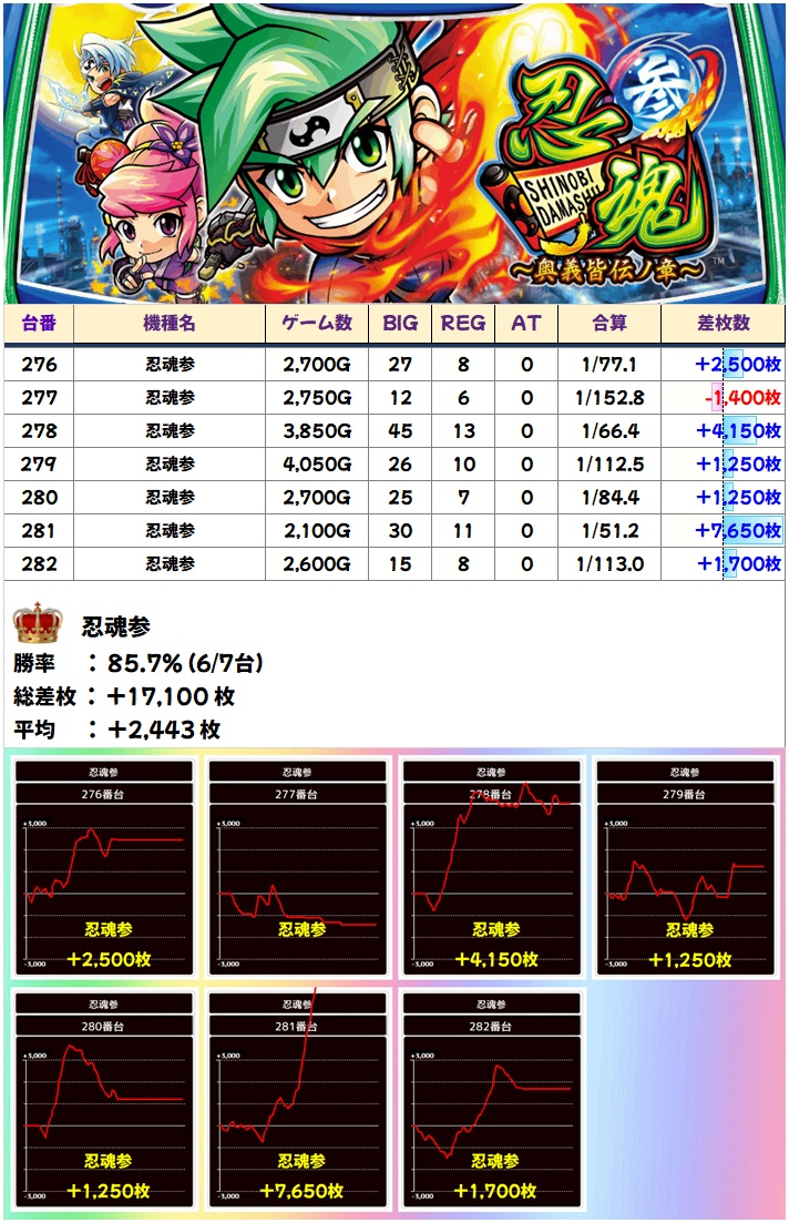 まずは忍魂参!6/7でプラス&平均+2443枚の好結果となっていただけに、こちらは全台系で間違いなしでしたね!打ち込みが足りていればもっと好結果になっていたハズ!?