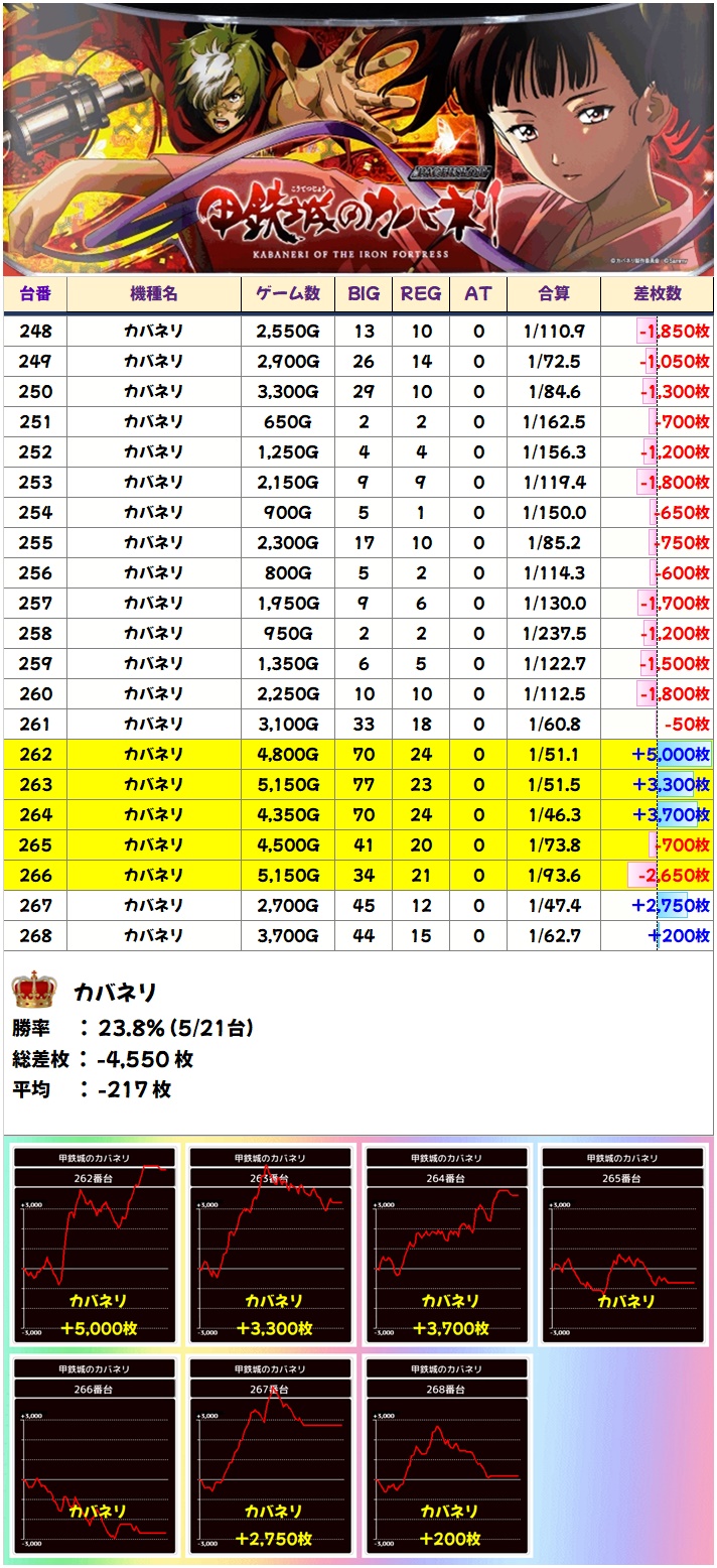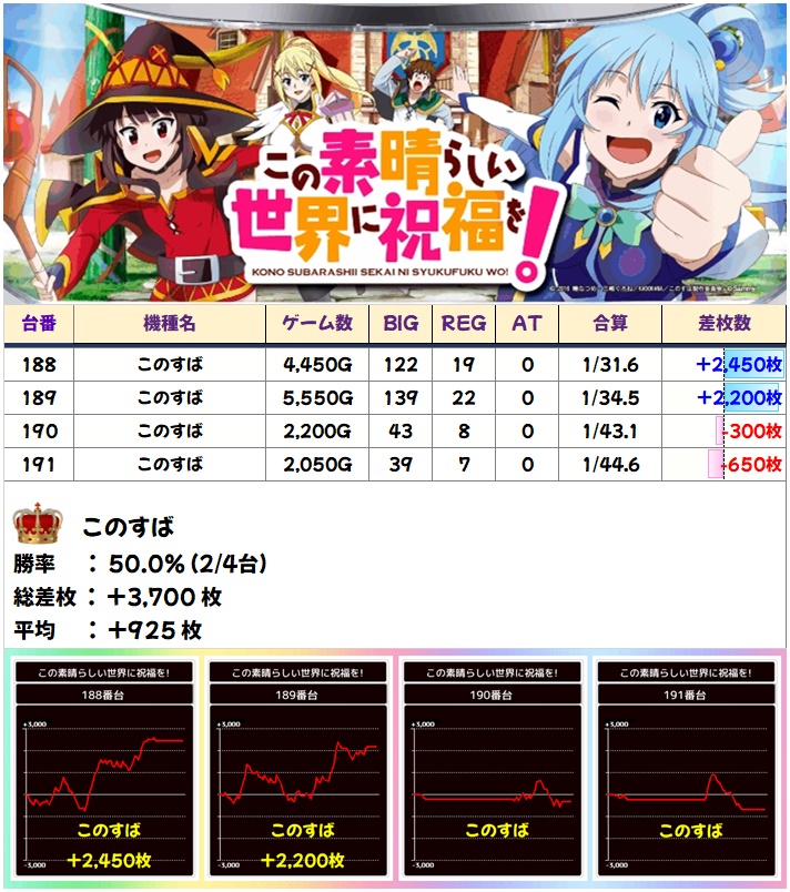 このすばからは2/4でプラスとニブイチっぽい感じでしたが、プラスだった2台のグラフが高挙動&マイナスだった2台もちゃんと初当たりを取れているだけに、打ち込みが足りていればもしかしたら好結果になっていた!?