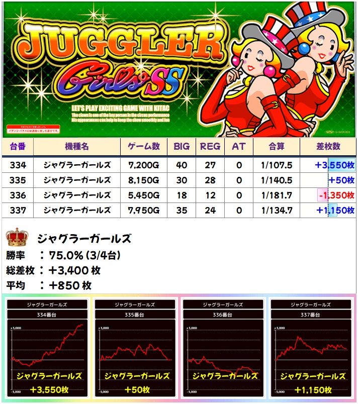 🌈ジャグラーガールズ(4台)【平均+850枚】