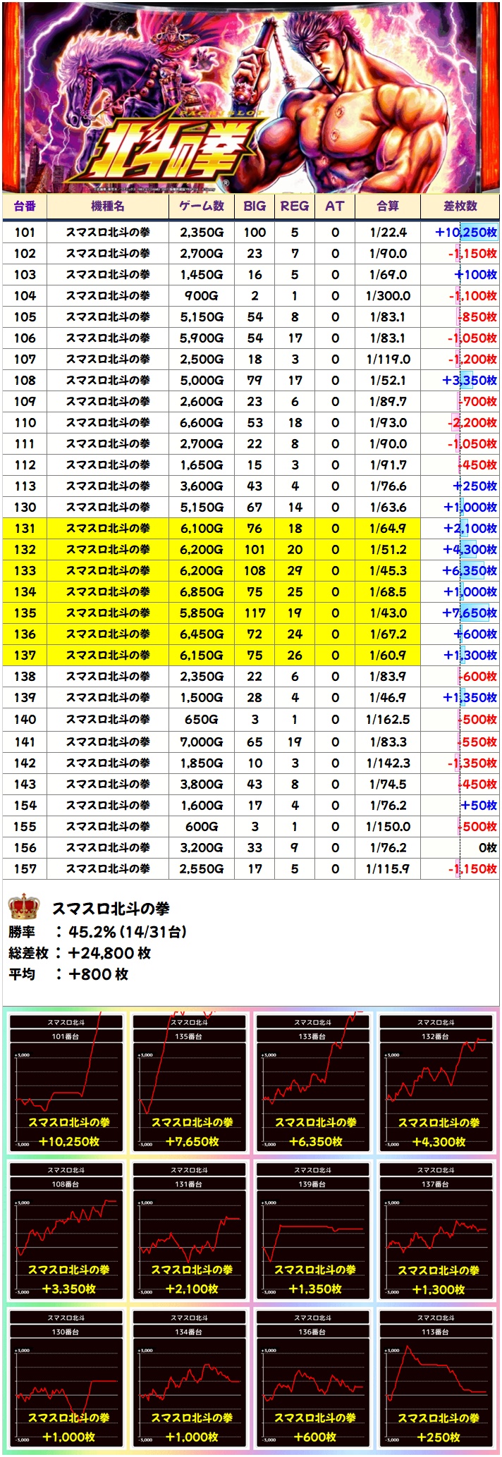 まずは看板機種の「北斗」!こちらは14/31でプラスと勝率がほぼニブイチ!注目すべきは131-137番台の7台並びで、こちらは初当たり回数的に並び仕掛けがあった可能性大!もしかしたら一番上の7台並びだった可能性も!?