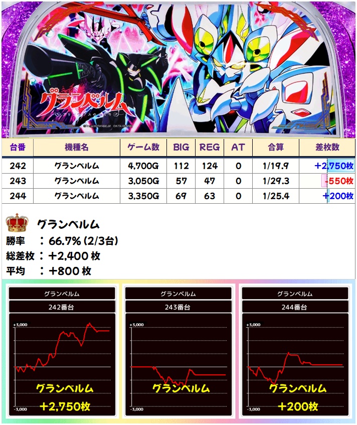 グランベルムは242番台は挙動的に上で間違いなし!勝率も2/3でプラスと、ニブイチ以上はありそうだった!?