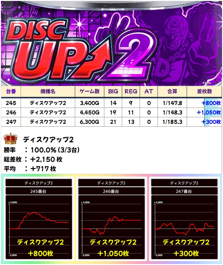 ディスクアップ2からは全台プラス!ボーナス合算的には245&246番台が高挙動だっただけにニブイチ以上はあったと予想します!