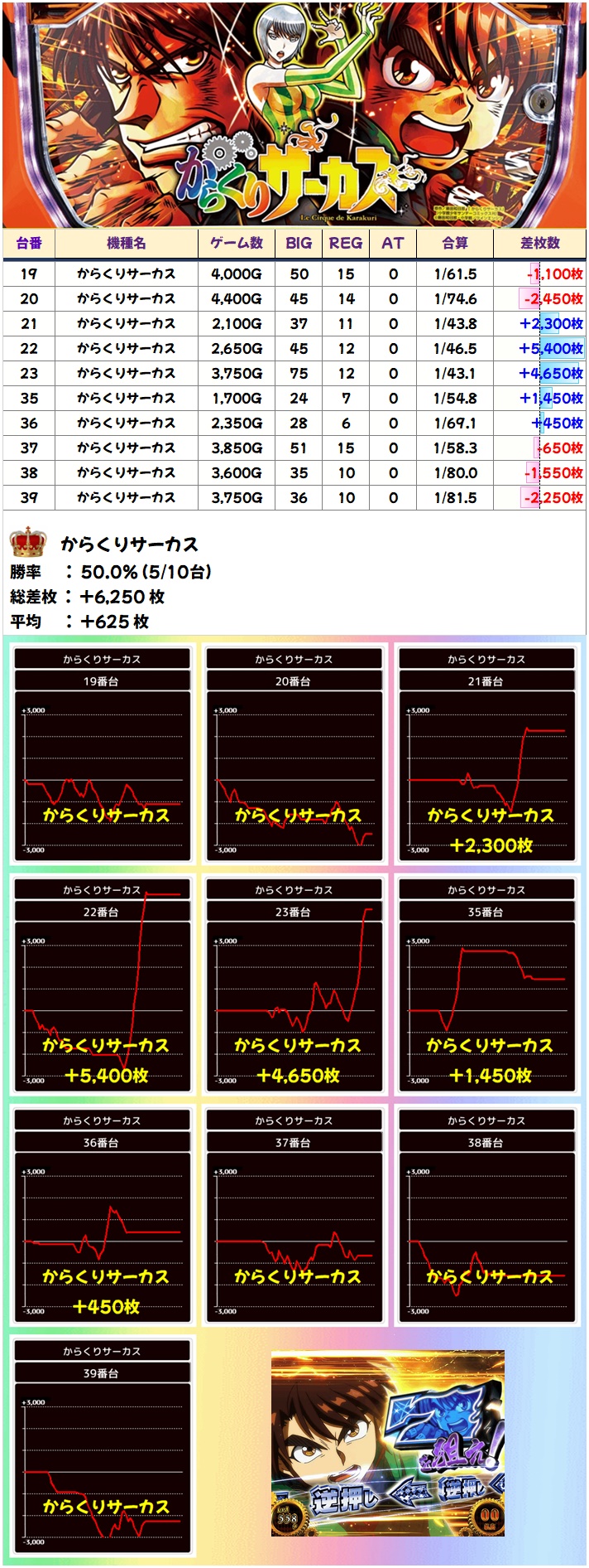 からくりサーカスからは5/10でプラスとニブイチに!からくりは21-23番台が並び仕掛けだったかも!?