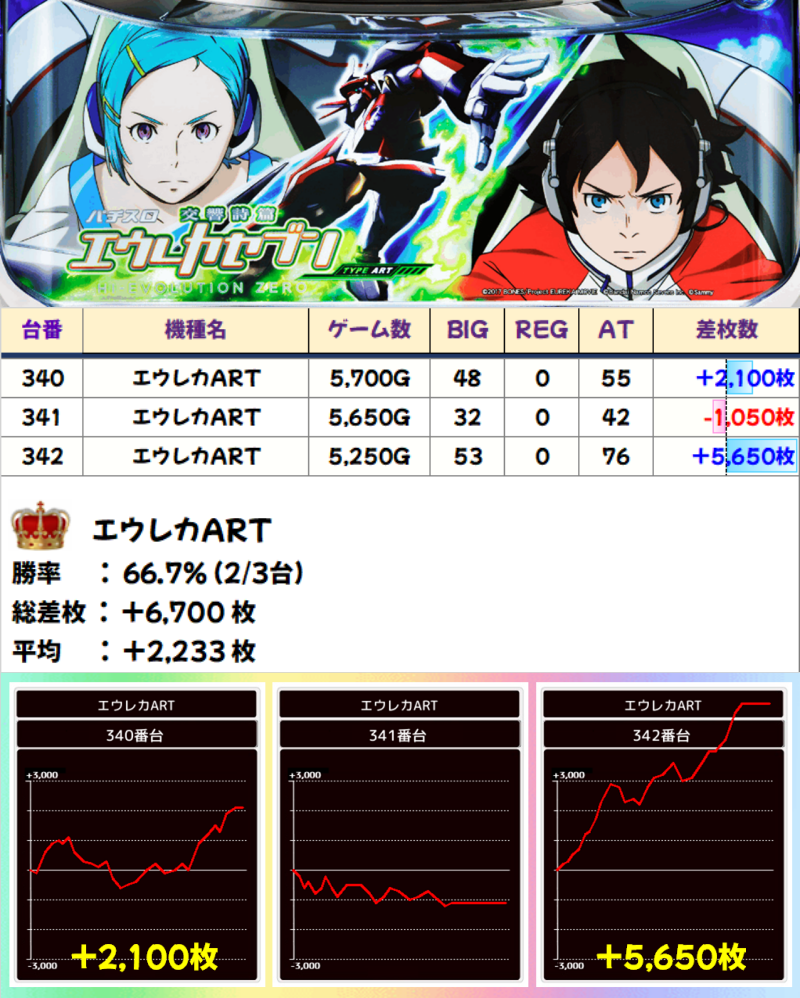 3台設置の「エウレカART」は3台中2台がプラスで全台系濃厚。機種総差枚+6,700枚、平均+2,233枚の結果に!