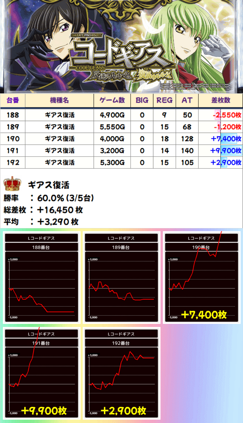 【全台系濃厚】スマスロコードギアス(3/5台)☆平均差枚+3290枚☆