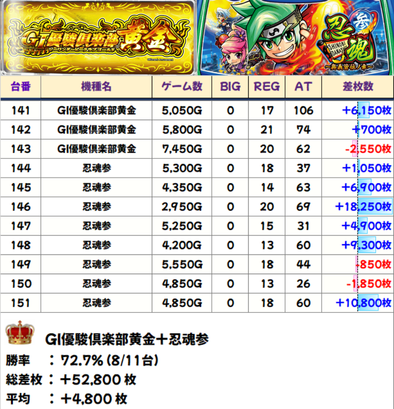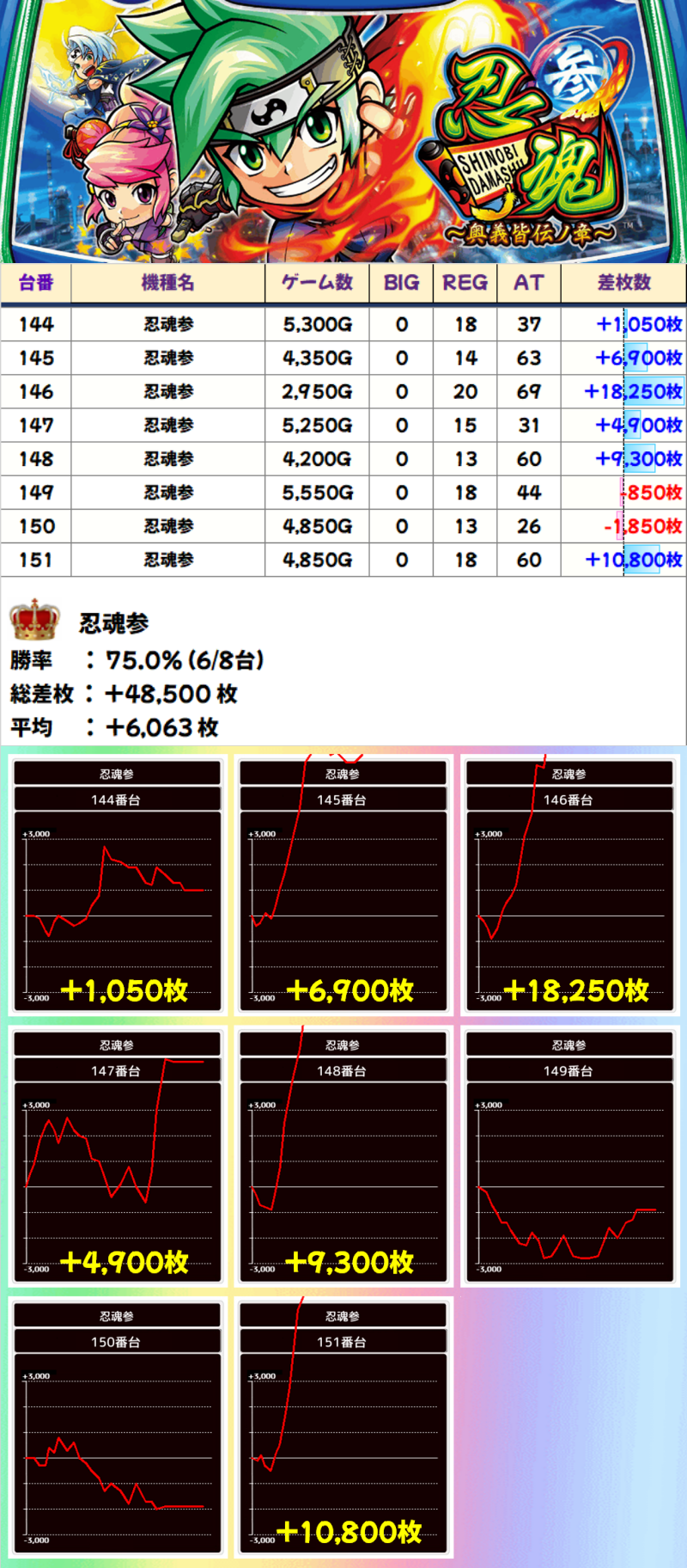 コンプリート台も飛び出した忍魂参は、8台中6台がプラスで文句なしの全台系濃厚。万枚台が2台あり、機種総差枚+48,500枚、平均+6,063枚と至極の結果に!