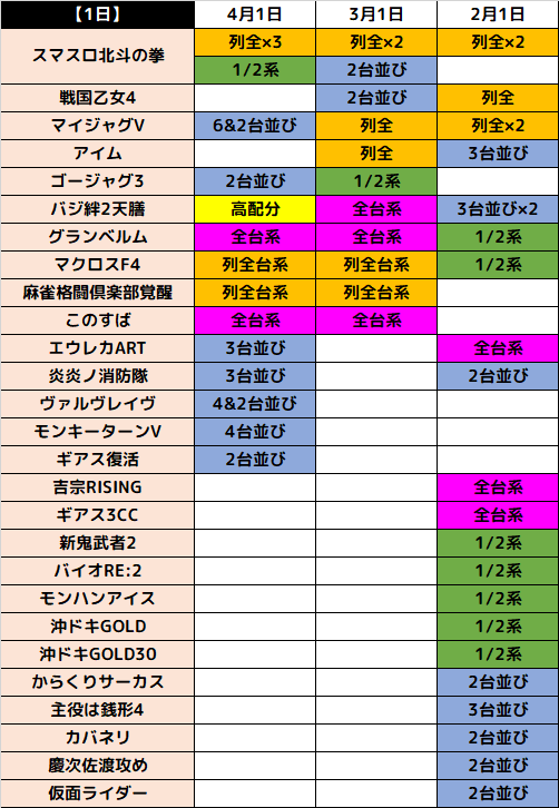 またスマスロ北斗には、3回連続で同じところが列全系になっているので、今回も期待が高まります。また、このすばとグランベルムが連続で全台系濃厚だったことも注目です!