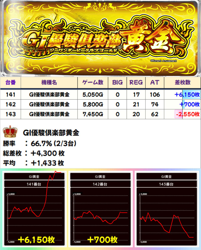 3台中2台がプラスの「GI優駿倶楽部黄金」は、機種総差枚+4,300枚、平均+1,433枚で全台系濃厚!