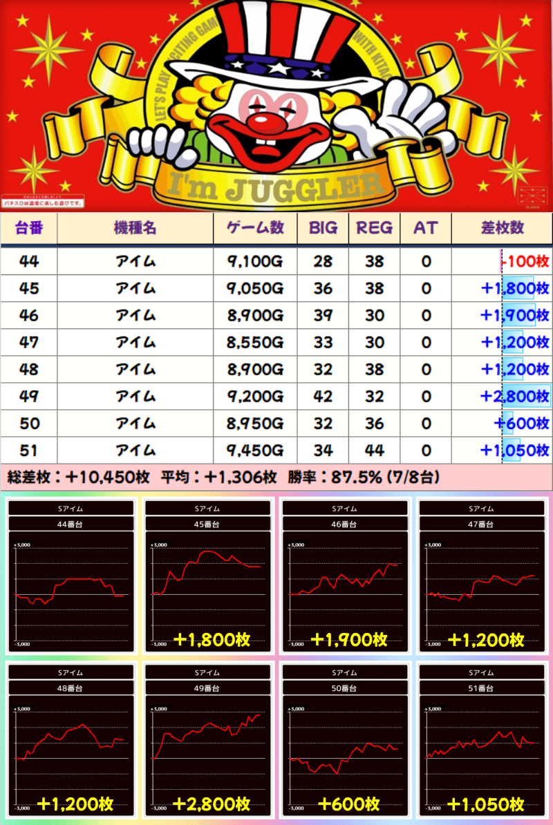 アイムジャグラーの44番~51番台の列も列全系でした。8台中7台がプラスで、平均差枚+1,306枚を記録しました!