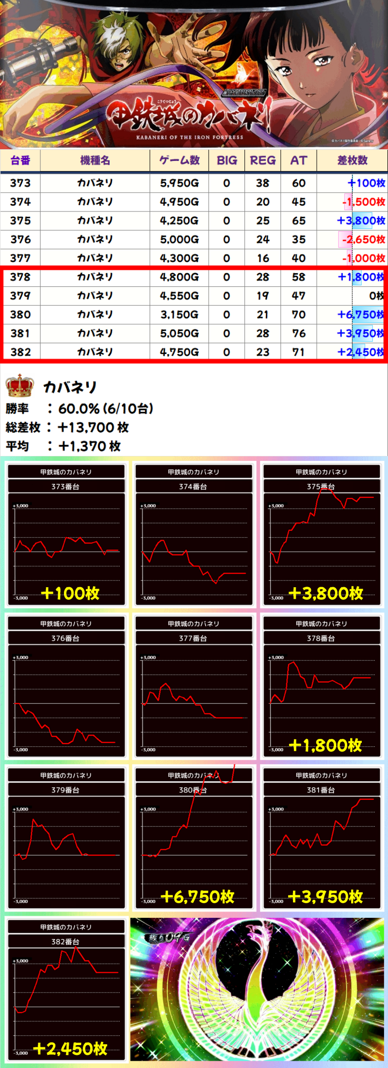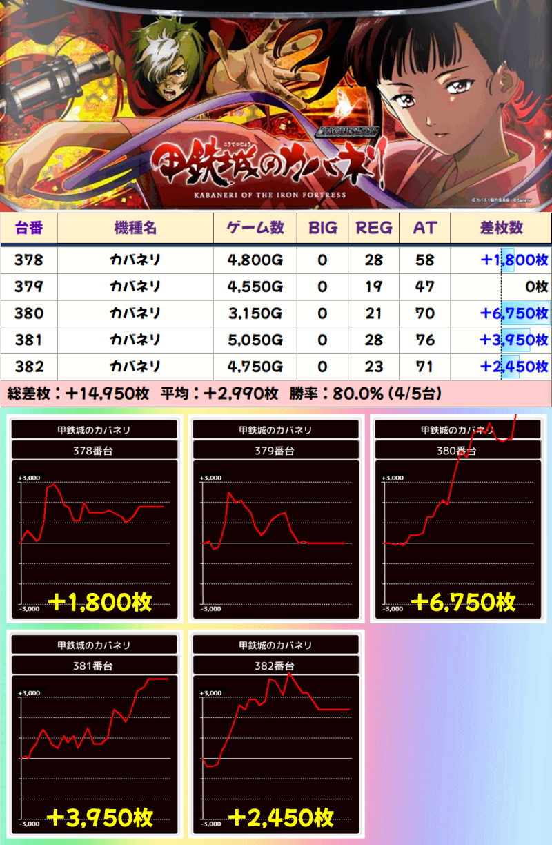カバネリの378番~382番台には5台並びがありました。マイナス台が1台もなく、平均差枚も+2,990枚でした!