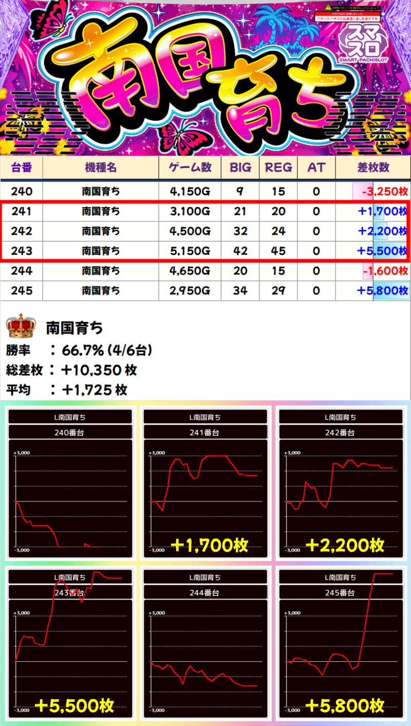 6台中4台がプラスだった「南国育ち」は1/2系濃厚。さらに241番~243番台は3台並びでもありました。結果は、機種総差枚+10,350枚、平均+1,725枚でした!
