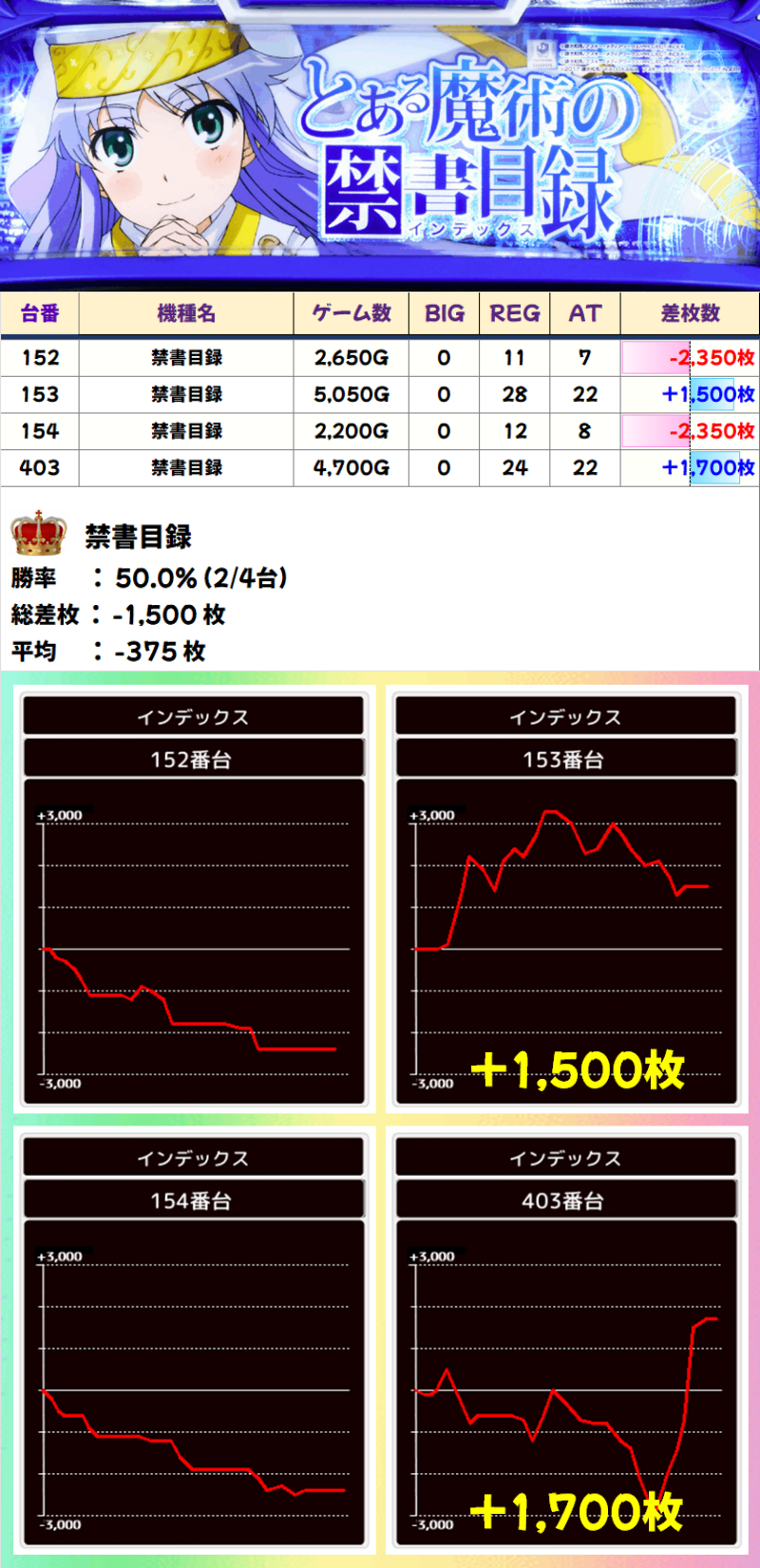 4台中2台がプラス差枚だった禁書目録は1/2系濃厚でした。
