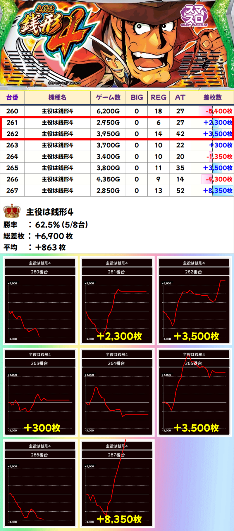 +8350枚を筆頭に、8台中5台がプラスだった「主役は銭形4」は、1/2系濃厚でした。ほかにも3千枚オーバー台が多数飛び出し、機種総差枚+6,900枚、平均+863枚のプラスの結果になりました!