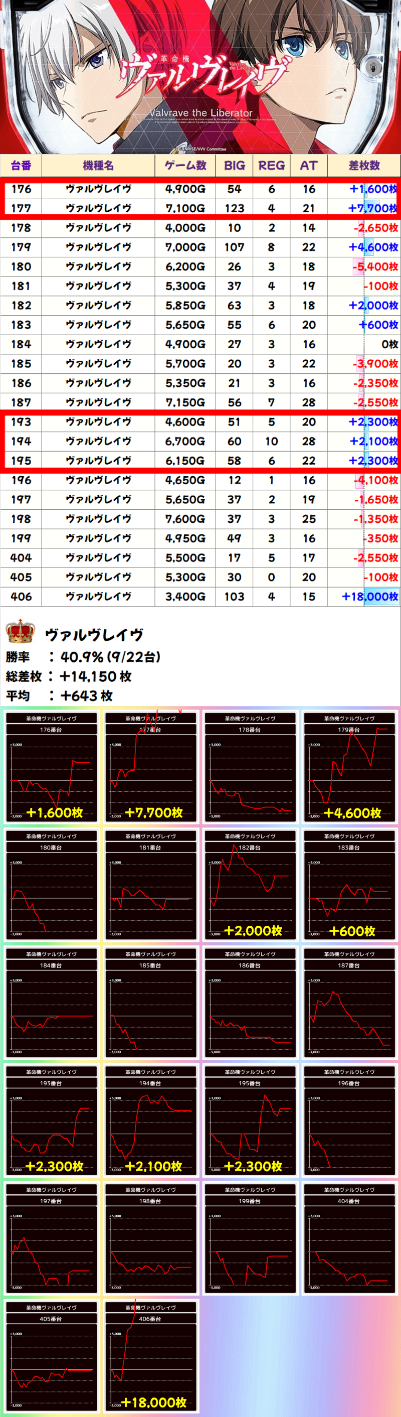22台中9台がプラスで1/2系が濃厚だったヴァルヴレイヴ。総差枚+14,150枚、平均差枚+643枚の結果でした!また、406番台がコンプリート達成していましたね。さらに、176-177番台に2台並び、193-195番台に3台並びもありました!