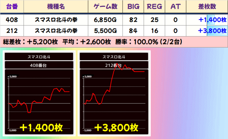 スマスロ北斗の拳には、今月もまたまた、列全系がありました。場所は前回とは異なる383番~389番台の列でした。7台全台がプラスで、平均+2,793枚と見事な結果でした!