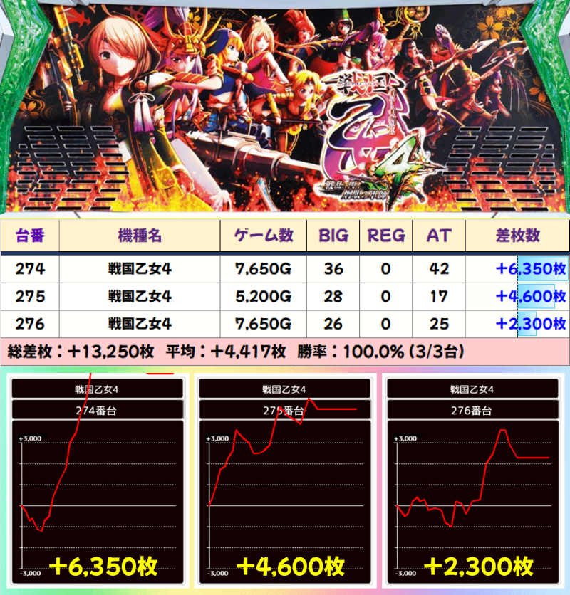 【3台並び】戦国乙女4(274-276番台)☆平均差枚+4417枚☆
