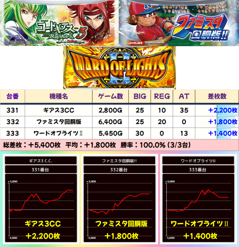 +9900枚を筆頭に5台中3台がプラスだったスマスロコードギアスは、平均差枚+3,290枚と圧巻の出玉!