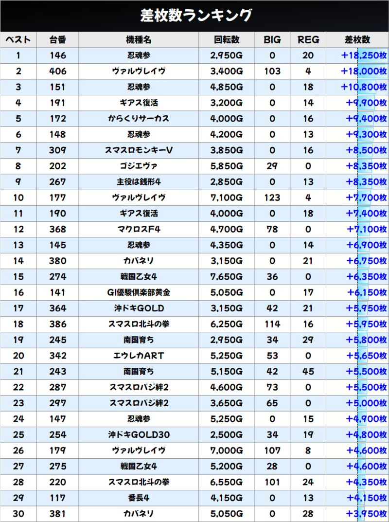 この日は、忍魂参とヴヴヴからコンプリート台が飛び出しました。素晴らしいですね。ほかにも、万枚目前台が大量にあった一日でした。この日は、23台が5000枚オーバーという素晴らしい結果になりました。