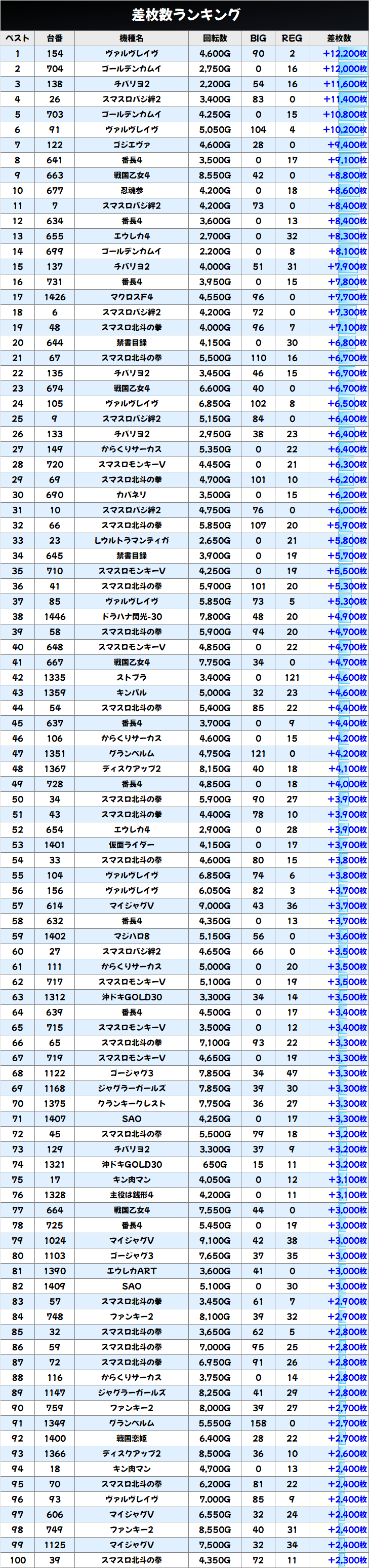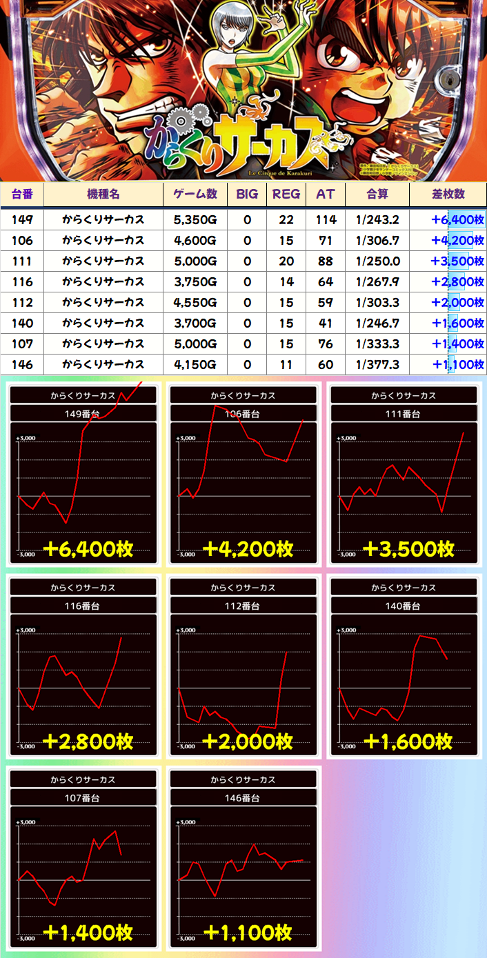 からくりサーカスは6400枚を筆頭に、2000枚以上の台が5台アリ‼