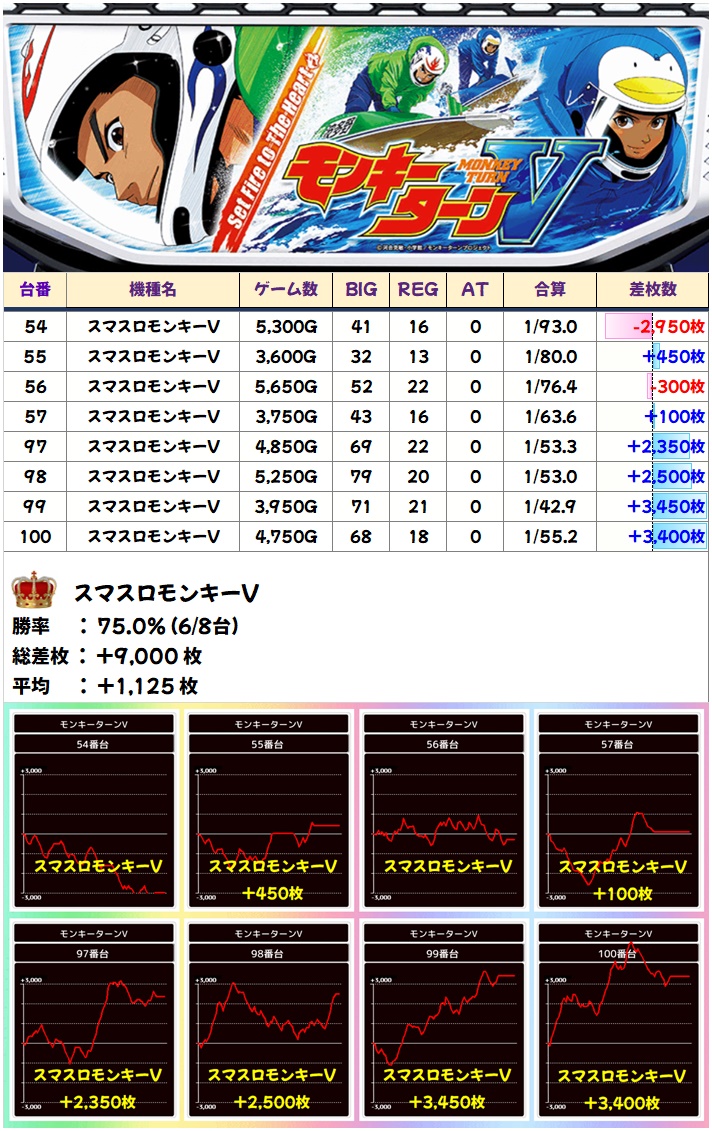 🌈スマスロモンキーV(8台)【平均+1125枚】