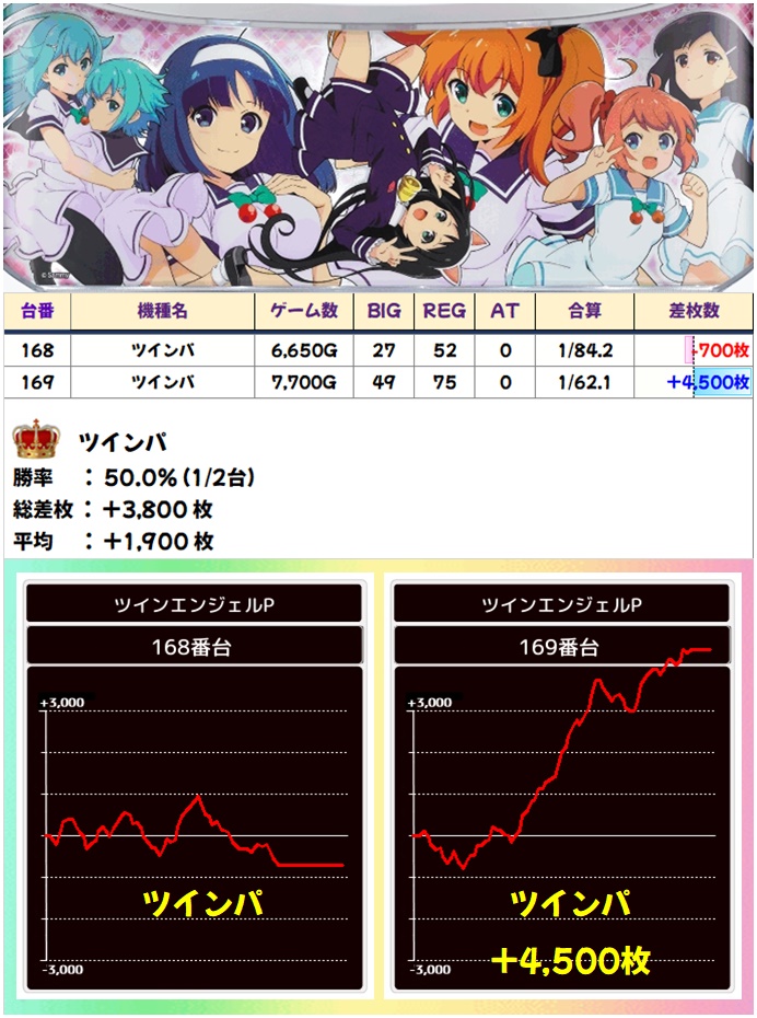 まずはツインパ!1台マイナスとなりましたが、粘られた可能性があるだけに示唆系が出ていた可能性大!プラスだった台は高挙動濃厚なだけに、こちらは全台系と予想します!