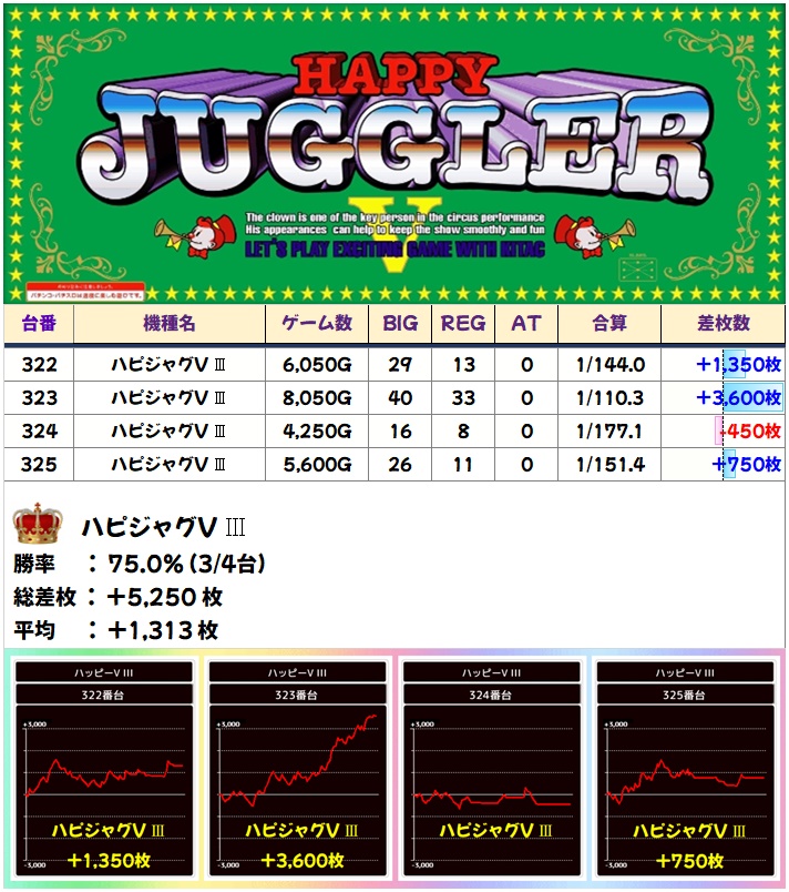 全機種に優秀台が多数ある状況でした。今回もハピジャグVⅢは3/4でプラスだっただけに、かなりの高配分だった!?マイジャグV・ファンキー2・ゴージャグ3もニブイチ以上とかなり強めでした!